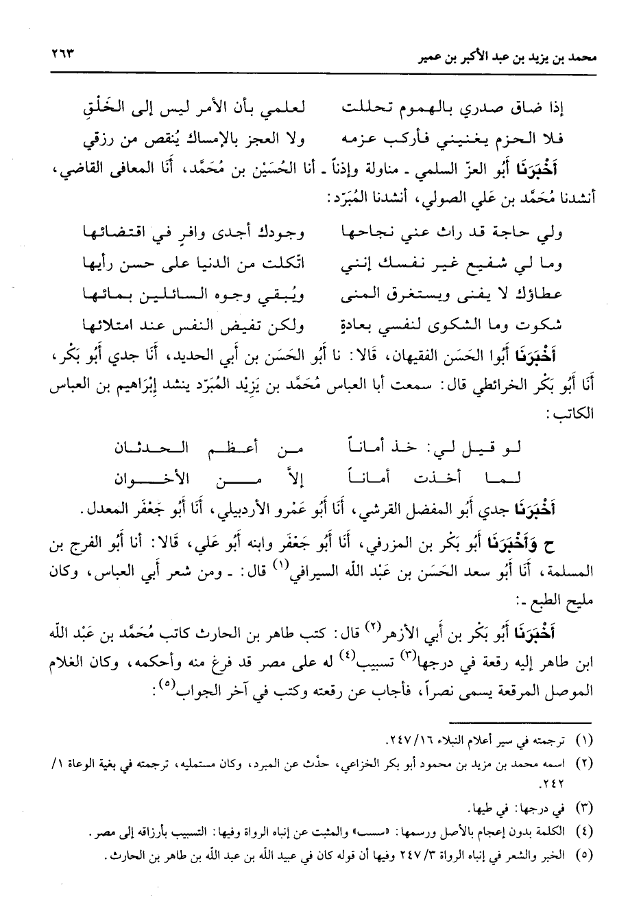 * إذا ضاق صدري بالهموم تحللت * لعلمي بأن الأمر ليس إلى الخلق فلا الحزم يغنيني فأركب عزمه * ولا العجز بالإمساك ينقص من رزقي * أخبرنا أبو العز السلمي مناولة وإذنا أنا الحسين بن محمد أنا المعافى القاضي أنشدنا محمد بن علي الصولي أنشدنا المبرد * ولي حاجة قد راث عني نجاحها * وجودك أجدى وافر في اقتضائها وما لي شفيع غير نفسك إنني * اتكلت من الدنيا على حسن رأيها عطاؤك لا يفنى ويستغرق المنى * ويبقي وجوه السائلين بمائها شكوت وما الشكوى لنفسي بعادة * ولكن تفيض النفس عند امتلائها * أخبرنا أبو الحسن الفقيهان قالا نا أبو الحسن بن أبي الحديد أنا جدي أبو بكر أنا أبو بكر الخرائطي قال سمعت أبا العباس محمد بن يزيد بن المبرد ينشد إبراهيم بن العباس الكاتب * لو قيل لي خذ أمانا * من أعظم الحدثان لما أخذت أمانا * إلا من الأخوان * أخبرنا جدي أبو المفضل القرشي أنا أبو عمرو الأردبيلي أنا أبو جعفر المعدل وأخبرنا أبو بكر بن المزرفي أنا أبو جعفر وابنه أبو علي قالا أنا أبو الفرج بن المسلمة أنا أبو سعد الحسن بن عبد الله السيرافي (1) قال ومن شعر أبي العباس وكان مليح الطبع أخبرنا أبو بكر بن أبي الأزهر (2) قال كتب طاهر بن الحارث كاتب محمد بن عبد الله ابن طاهر إليه رقعة فدرجها (3) تسبيب (4) له على مصر قد فرغ منه وأحكمه وكان الغلام الموصل المرقعة يسمى نصرا فأجاب عن رقعته وكتب في آخر الجواب (5)