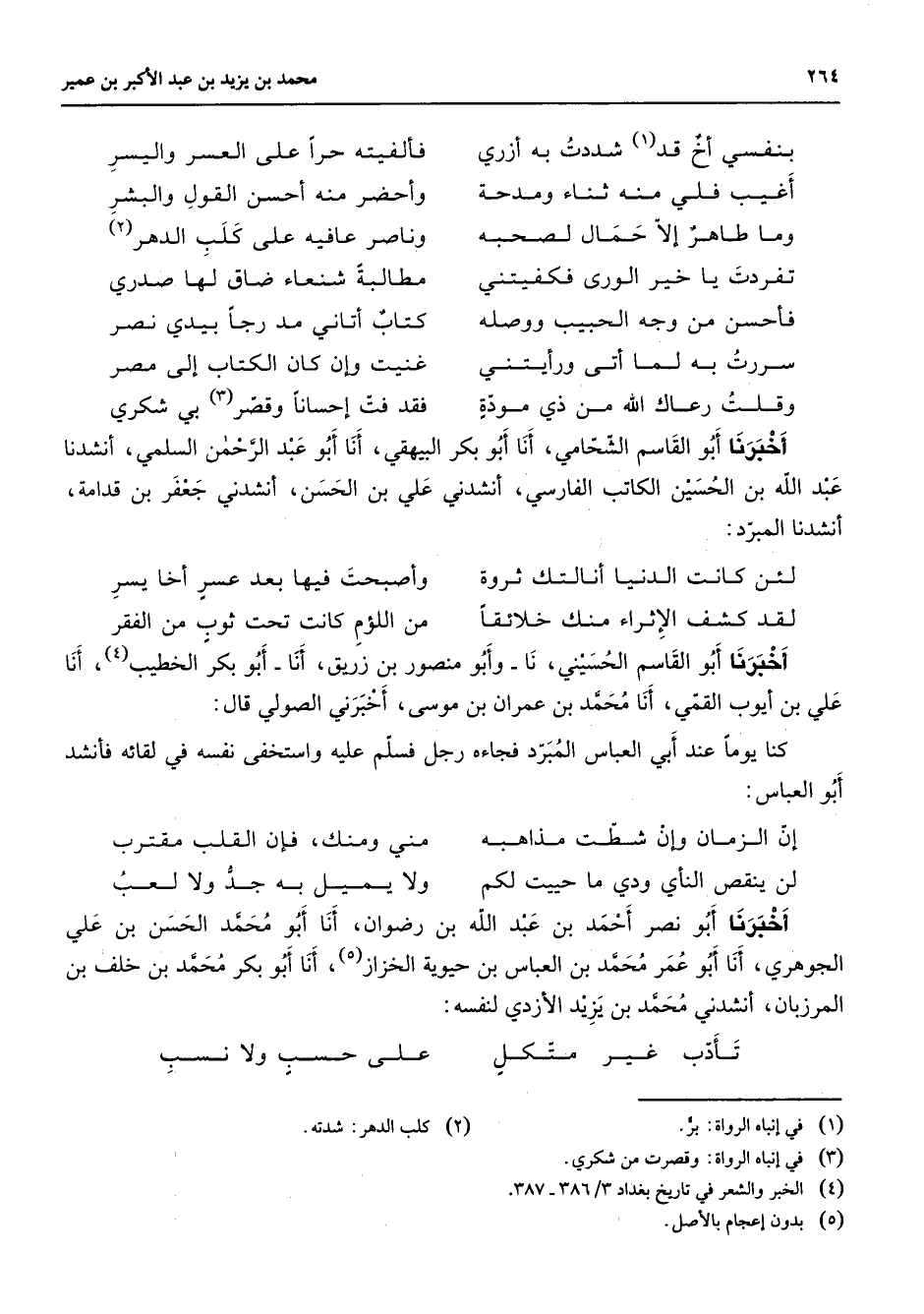 * بنفسي أخ قد (1) شددت به أزري * فألفيته حرا على العسر واليسر أغيب فلي منه ثناء ومدحة * وأحضر منه أحسن القول والبشر وما طاهر إلا حمال لصحبه * وناصر عافيه على كلب الدهر تفردت يا خير الورى فكفيتني * مطالبة شنعاء ضاق لها صدري فأحسن من وجه الحبيب ووصله * كتاب أتاني مد رجا بيدي نصر سررت به لما أتى ورأيتني * غنيت وإن كان الكتاب إلى مصر وقلت رعاك الله من ذي مودة * فقد فت إحسانا وقصر بي شكري * أخبرنا أبو القاسم الشحامي أنا أبو بكر البيهقي أنا أبو عبد الرحمن السلمي أنشدنا عبد الله بن الحسين الكاتب الفارسي أنشدني علي بن الحسن أنشدني جعفر بن قدامة أنشدنا المبرد * لئن كانت الدنيا أنالتك ثروة * وأصبحت فيها بعد عسر أخا يسر لقد كشف الإثراء منك خلائقا * من اللؤم كانت تحت ثوب من الفقر * أخبرنا أبو القاسم الحسيني نا وأبو منصور بن زريق أنا أبو بكر الخطيب أنا علي بن أيوب القمي أنا محمد بن عمران بن موسى أخبرني الصولي قال كنا يوما عند أبي العباس المبرد فجاءه رجل فسلم عليه واستخفى نفسه في لقائه فأنشد أبو العباس * إن الزمان وإن شطت مذاهبه * مني ومنك فإن القلب مقترب لن ينقص النأي ودي ما حييت لكم * ولا يميل به جد ولا لعب * أخبرنا أبو نصر أحمد بن عبد الله بن رضوان أنا أبو محمد الحسن بن علي الجوهري أنا أبو عمر محمد بن العباس بن حيوية الخزاز (5) أنا أبو بكر محمد بن خلف بن المرزبان أنشدني محمد بن يزيد الأزدي لنفسه * تأدب غير متكل * على حسب ولا نسب