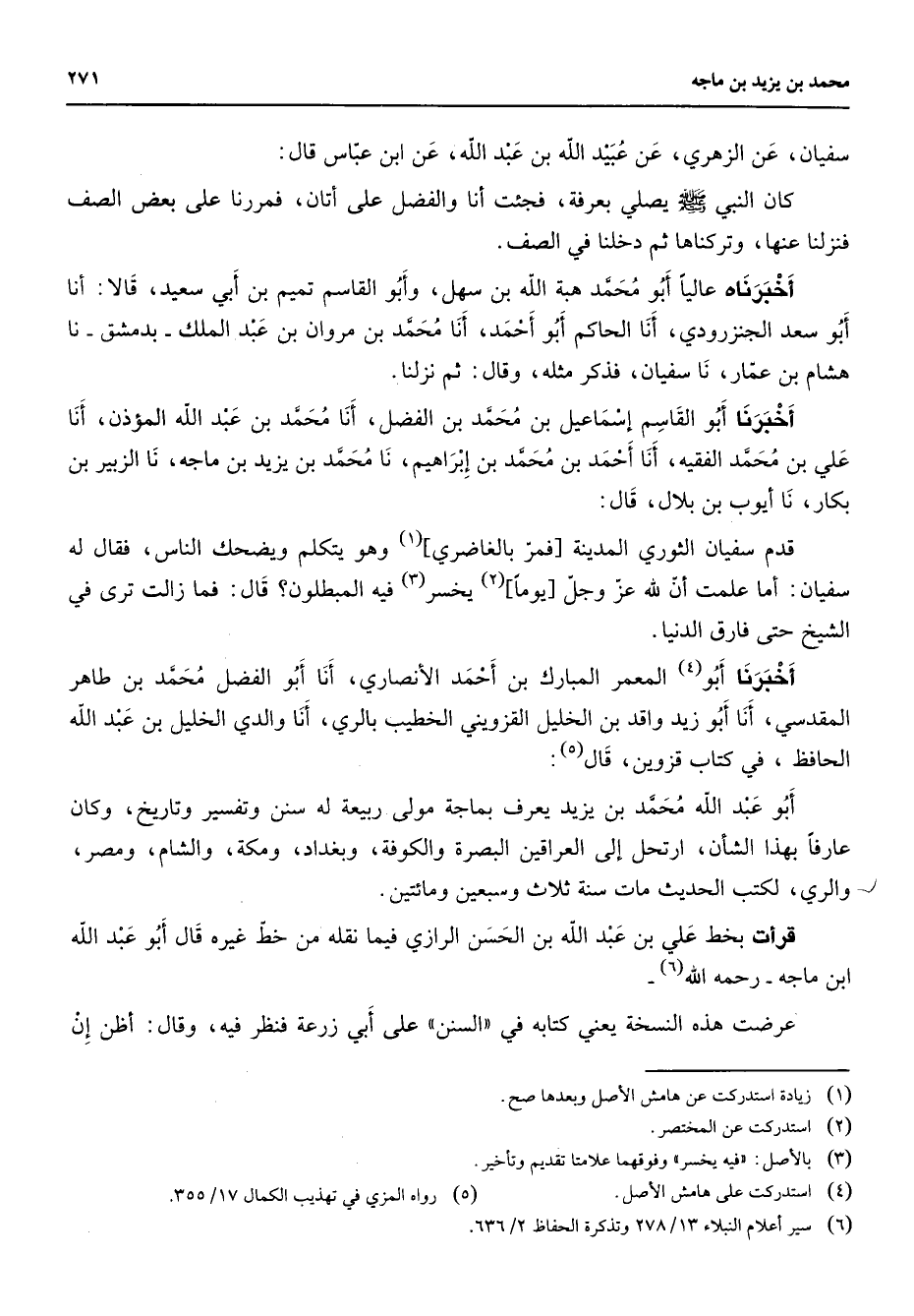 سفيان عن الزهري عن عبيد الله بن عبد الله عن ابن عباس قال كان النبي (صلى الله عليه وسلم) يصلي بعرفة فجئت أنا والفضل على أتان فمررنا على بعض الصف فنزلنا عنها وتركناها ثم دخلنا في الصف أخبرناه عاليا أبو محمد هبة الله بن سهل وابو القاسم تميم بن أبي سعيد قالا أنا أبو سعد الجنزرودي أنا الحاكم أبو أحمد أنا محمد بن مروان بن عبد الملك بدمشق نا هشام بن عمار نا سفيان فذكر مثله وقال ثم نزلنا أخبرنا أبو القاسم إسماعيل بن محمد بن الفضل أنا محمد بن عبد الله المؤذن أنا علي بن محمد الفقيه أنا أحمد بن محمد بن إبراهيم نا محمد بن يزيد بن ماجه نا الزبير بن بكار نا أيوب بن بلال قال قدم سفيان الثوري المدينة فمر بالغاضري (1) وهو يتكلم ويضحك الناس فقال له سفيان أما علمت أن لله عز وجل يوما (2) يخسر (3) فيه المبطلون قال فما زالت ترى في الشيخ حتى فارق الدنيا أخبرنا أبو (4) المعمر المبارك بن أحمد الأنصاري أنا أبو الفضل محمد بن طاهر المقدسي أنا أبو زيد واقد بن الخليل القزويني الخطيب بالري أنا والدي الخليل بن عبد الله الحافظ في كتاب قزوين قال (5) أبو عبد الله محمد بن يزيد يعرف بماجة مولى ربيعة له سنن وتفسير وتاريخ وكان عارفا بهذا الشأن ارتحل إلى العراقين البصرة والكوفة وبغداد ومكة والشام ومصر والري لكتب الحديث مات سنة ثلاث وسبعين ومائتين قرأت بخط علي بن عبد الله بن الحسن الرازي فيما نقله مخط غيره قال أبو عبد الله ابن ماجه رحمه الله (6) عرضت هذه النسخة يعني كتابه في السنن على أبي زرعة فنظر فيه وقال أظن إن