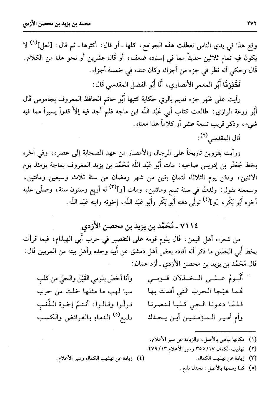 7114 - محمد بن يزيد بن محصن الأزدي من شعراء أهل اليمن قال يلوم قومه على التقصير في حرب أبي الهيذام فيما قرأت بخط ابي الحسن ما ذكر أنه أفاده بعض أهل دمشق عن أبيه وجده وأهل بيته من المريين قال قال محمد بن يزيد بن محصن الأزدي أزد عمان * ألوم على الخذلان قومي * وأنا أخص بلومي القين والحي من كلب هما هيجا الحرب التي أفدت بها * سبا لهب ما مثلها خلت من حرب فلما دعونا الحي كلبا لنصرنا * تولوا وقالوا أنتم إخوة الذنب وأم أمير المؤمنين أين يحدك * يلمع (5) الدماء بالفرائض والكسب
