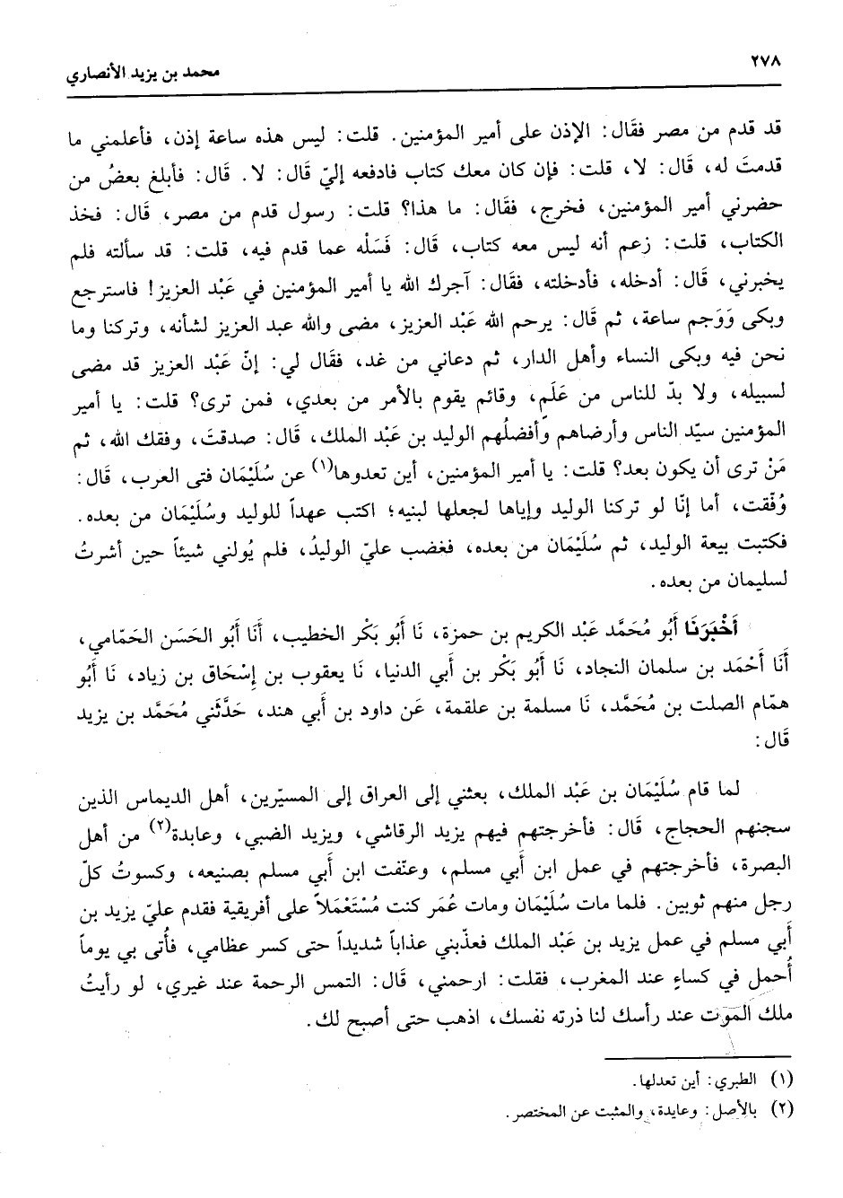 قد قدم من مصر فقال الإذن على أمير المؤمنين قلت ليس هذه ساعة إذن فأعلمني ما قدمت له قال لا قلت فإن كان معك كتاب فادفعه إلي قالا قال فأبلغ بعض من حضرني أمير المؤمنين فخرج فقال ما هذا قلت رسول قدم من مصر قال فخذ الكتاب قلت زعم أنه ليس معه كتاب قال فسله عما قدم فيه قلت قد سألته فلم يخبرني قال أدخله فأدخلته فقال آجرك الله يا أمير المؤمنين في عبد العزيز فاسترجع وبكى ووجم ساعة ثم قال يرحم الله عبد العزيز مضى والله عبد العزيز لشأنه وتركنا وما نحن فيه وبكى النساء وأهل الدار ثم دعاني من غد فقال لي إن عبد العزيز قد مضى لسبيله ولا بد للناس من علم وقائم يقوم بالأمر من بعدي فمن ترى قلت يا أمير المؤمنين سيد الناس وأرضاهم وأفضلهم الوليد بن عبد الملك قال صدقت وفقك الله ثم من ترى أن يكون بعد قلت يا أمير المؤمنين أين تعدوها (1) عن سليمان فتى العرب قال وفقت أما إنا لو تركنا الوليد وإياها لجعلها لبنيه اكتب عهدا للوليد وسليمان من بعده فكتبت بيعة الوليد ثم سليمان من بعده فغضب علي الوليد فلم يولني شيئا حين أشرت لسليمان من بعده أخبرنا أبو محمد عبد الكريم بن حمزة نا أبو بكر الخطيب أنا أبو الحسن الحمامي أنا أحمد بن سلمان النجاد نا أبو بكر بن أبي الدنيا نا يعقوب بن إسحاق بن زياد نا أبو همام الصلت بن محمد نا مسلمة بن علقمة عن داود بن أبي هند حدثني محمد بن يزيد قال لما قام سليمان بن عبد الملك بعثني إلى العراق المسيرين أهل الديماس الذين سجنهم الحجاج قال فأخرجتهم فيهم يزيد الرقاشي ويزيد الضبي وعابدة (2) من أهل البصرة فأخرجتهم في عمل ابن أبي مسلم وعنفت ابن ابي مسلم بصنيعه وكسوت كل رجل منهم ثوبين فلما مات سليمان ومات عمر كنت مستعملا على أفريقية فقدم علي يزيد بن أبي مسلم في عمل يزيد بن عبد الملك فعذبني عذابا شديدا حتى كسر عظامي فأتي بي يوما أحمل في كساء عند المغرب فقلت ارحمنى قال التمس الرحمة عند غيري لو رايت ملك الموت عند رأسك لنا ذرته نفسك اذهب حتى أصبح لك