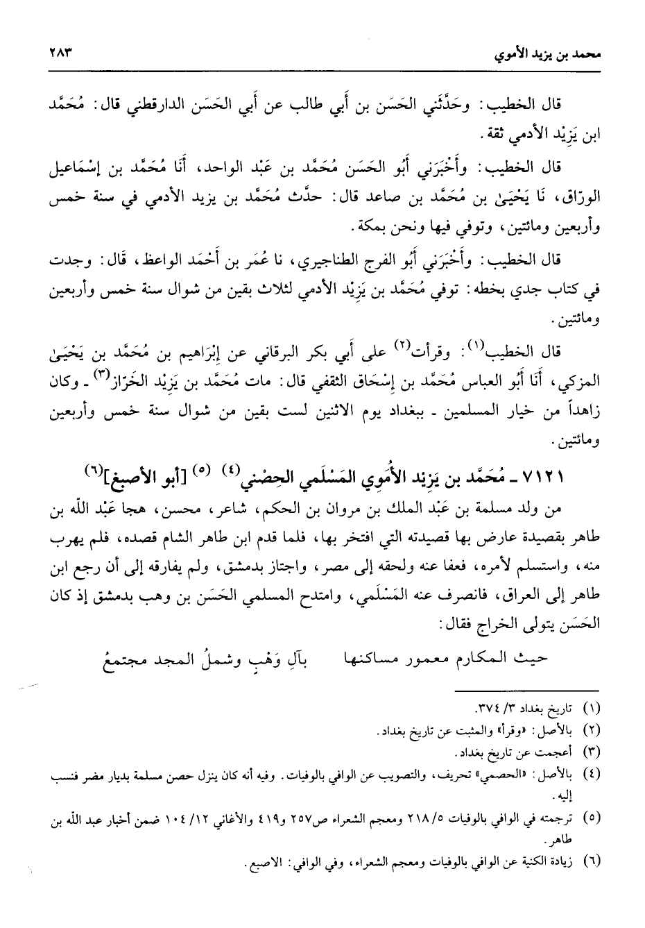 7121 - محمد بن يزيد الأموي المسلمي الحصني (4) (5) أبو الأصبغ (6) من ولد مسلمة بن عبد الملك بن مروان بن الحكم شاعر محسن هجا عبد الله بن طاهر بقصيدة عارض بها قصيدته التي افتخر بها فلما قدم ابن طاهر الشام قصده فلم يهرب منه واستسلم لأمره فعفا عنه ولحقه إلى مصر واجتاز بدمشق ولم يفارقه إلى أن رجع ابن طاهر إلى العراق فانصرف عنه المسلمي وامتدح المسلمي الحسن بن وهب بدمشق إذ كان الحسن يتولى الخراج فقال * حيث المكارم معمور مساكنها * بآل وهب وشمل المجد مجتمع