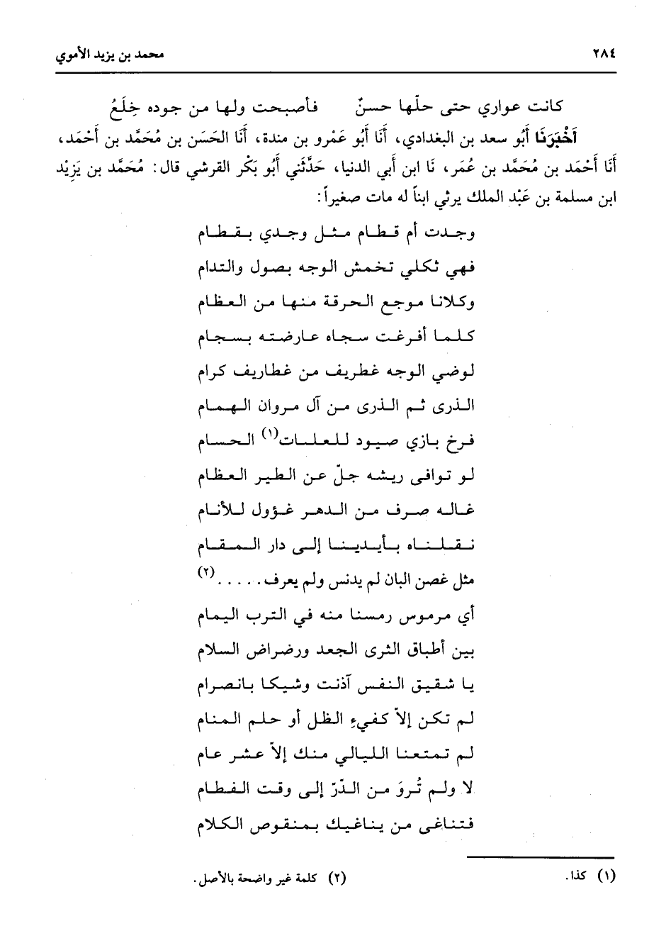 كانت عواري حتحلها حسن * فأصبحت ولها من جوده خلع * أخبرنا أبو سعد بن البغدادي أنا أبو عمر بن مندة أنا الحسن بن محمد بن أحمد أنا أحمد بن محمد بن عمر نا ابن أبي الدنيا حدثني أبو بكر القرشي قال محمد بن يزيد ابن مسلمة بن عبد الملك يرثي ابنا له مات صغيرا * وجدت أم قطام مثل وجدي بقطام * فهي ثكلي تخمش الوجه بصول والتدام * وكلانا موجع الحرقة منها من العظام * كلما أفرغت سجاه عارضته بسجام * لوضي الوجه غطريف من غطاريف كرام * الذرى ثم الذرى من آل مروان الهمام * فرخ بازي صيود للعليات (1) الحسام * لو توافي ريشه جل عن الطير العظام * غاله صرف من الدهر غؤول للأنام * نقلناه بأيدينا إلى دار المقام * مثل غصن البان لم يدنس ولم يعرف (2) * أي مرموس رمسنا منه في الترب اليمام * بين أطباق الثرى الجعد ورضراض السلام * يا شقيق النفس آذنت وشيكا بانصرام * لم تكن إلا كفئ الظل أو حلم المنام * لم تمتعنا الليالي منك إلا عشر عام * لا ولم ترو من الدر إلى وقت الفطام * فتناغى من يناغيك بمنقوص الكلام *