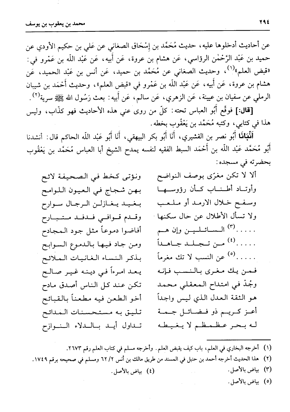 عن أحاديث أدخلوها عليه حديث محمد بن إسحاق الصغاني عن علي بن حكيم الأودي عن حميد بن عبد الرحمن الرؤاسي عن هشام بن عروة عن أبيه عن عبد الله بن عمرو في قبض العلم (1) وحديث الصغاني عن محمد بن حميد عن أنس بن عبد الحميد عن هشام بن عروة عن أبيه عن عبد الله بن عمرو في قبض العلم وحديث أحمد بن شيبان الرملي عن سفيان بن عيينة عن الزهري عن سالم عن أبيه بعث رسول الله (صلى الله عليه وسلم) سرية (2) قال فوقع أبو العباس تحته كل من روى عني هذه الأحاديث فهو كذاب وليس هذا في كتابي وكتبه محمد بن يعقوب بخطه أنبأنا أبو نصر بن القشيري أنا أبو بكر البيهقي أنا أبو عبد الله الحاكم قال أنشدنا أبو محمد عبد الله بن أحمد السبط الفقيه لنفسه يمدح الشيخ ابا العباس محمد بن يعقوب بحضرته في مسجده * ألا لا تكن مغرى بوصف النواضح * ونؤتى كخط في الصحيفة لائح وأوتاد أطناب كأن رؤوسها * بهن شجاج في العيون اللوامح وسفح من خلال الأرمد أو ملعب * بغيد يغازلن الرجال سوارح ولا تسال الأطلال عن حال سكنها * وقدم قوافي فدفد متبارح (3) السائلين وإن هم * افاضوا دموعا مثل جود المجادح (4) من تجلد جاهدا * ومن جاد فيها بالدموع السوابح عن النسب لا تك مغرما * بذكر النساء الغانيات الملائح (5) فمن يك مغرى بالنسب فإنه * يعد امرءا في دينه غير صالح وجد في امتداح المعقلي محمد * تكن عند كل الناس أصدق مادح هو الثقة العدل الذي ليس واجدا * أخو الطعن فيه مطعنا بالقبائح أعز كريم ذو فضائل جمة * تليق به مستحسنات المدائح له بحر عظمظم لا يغيطه * تداول أيد بالدلاء النوازح