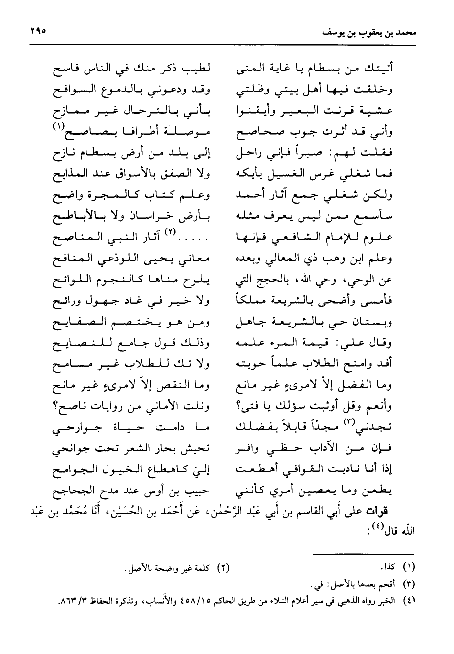 * * أتيتك من بسطام يا غاية المنى * لطيب ذكر منك في الناس فاسح وخلقت فيها أهل بيتي وظلتي * وقد ودعوني بالدموع السوافح عشية قرنت البعير وأيقنوا * بأني بالترحال غير ممازح وأني قد أثرت جوب صحاصح * موصلة أطرافا بصاصح (1) فقلت لهم صبرا فإني راحل * إلى بلد من ارض بسطام نازح فما شغلي غرس الغسيل بأيكه * ولا الصفق بالأسواق عند المذابح ولكن شغلي جمع آثار أحمد * وعلم كتاب كالمجرة واضح سأسمع ممن ليس يعرف مثله * بأرض خراسان ولا بالأباطح علوم للإمام الشافعي فإنها * (2) آثار النبي المناصح وعلم ابن وهب ذي المعالي وبعده * معاني يحيى اللوذعي المنافح عن الوحي وحي الله بالحجج التي * يلوح مناها كالنجوم الللوائح فأمسى وأضحى بالشريعة مملكا * ولا خير في غاد جهول ورائح وبستان حي بالشريعة جاهل * ومن هو يختصم الصفايح * * وقال علي قيمة المرء علمه * وذلك قول جامع للنصايح أفد وامنح الطلاب علما حويته * ولا تك للطلاب غير مسامح وما الفضل إلا لامرئ غير مانع * وما النقص غلا لامرئ غير مانح وأنعم وقل أوثبت سؤلك يا فتى * ونلت الأماني من روايات ناصح * * تجدني (3) مجدا قابلا بفضلك * ما دامت حياة جوارحي فإن من الآداب حظي وافر * تحيش بحار الشعر تحت جوانحي * * إذا أنا ناديت القوافي أهطعت * إلي كاهطاع الخيول لجوامح يطعن وما يعصين أمري كأنني * حبيب بن أوس عند مدح الجحاجح * قرات على أبي القاسم بن أبي عبد الرحمن عن أحمد بن الحسين أنا محمد بن عبد الله قال (4)