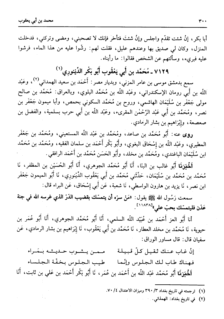 7129 - محمد بن ابي يعقوب أبو بكر الدينوري (1) سمع بدمشق موسى بن عامر المزني وبديار مصر أحمد بن سعيد الهمداني (2) وعبد الله بن أبي رومان الأسكندراني وعبد الله بن محمد البلوي وبالعراق محمد بن صالح مولى جعفر بن سليمان الهاشمي وروح بن محمد السكوني بحمص وأبا ميمون جعفر بن نصر ومحمد بن أبي عبد الرحمن المقرئ وعبد الله بن أبي حرب بسلمية والفضل بن صعصعة وإبراهيم بن بشار الرمادي روى عنه أبو محمد بن صاعد ومحمد بن عبد الله المستعيني ومحمد بن جعفر المطيري وعبد الله بن إسحاق البغوي وأبو بكر أحمد بن سلمان الفقيه ومحمد بن محمد ابن سليمان الباغندي ومحمد بن مخلد وابو الحسن محمد بن أحمد الرافقي أخبرنا أبو غالب بن البنا أنا أبو محمد الجوهري أنا أبو الحسين بن المظفر نا محمد بن محمد بن سليمان حدثني محمد بن أبي يعقوب الدينوري نا أبو الميمون جعفر ابن نصر نا يزيد بن هارون الواسطي نا شعبة عن أبي إسحاق عن البراء قال سمعت رسول الله (صلى الله عليه وسلم) يقول من سره أن يتمسك بقضيب الدر الذي غرسه الله في جنة عدن فليتمسك بحب علي أنا أبو العز أحمد بن عبيد الله السلمي أنا أبو محمد الجوهري أنا أبو عمر بن حيوية نا محمد بن مخلد العطار نا محمد بن أبي يعقوب نا إبراهيم بن بشار الرمادي عن سفيان قال قال مساور الوراق * إن غاب عنك ثقيل كل قبيلة * ممن يشوب حديثه بمراء فهناك طاب لك الجلوس وإنما * طيب الجلوس بخفة الجلساء * أخبرنا أبو محمد عبد الله بن أحمد بن عمر نا أبو بكر أحمد بن علي بن ثابت أنا