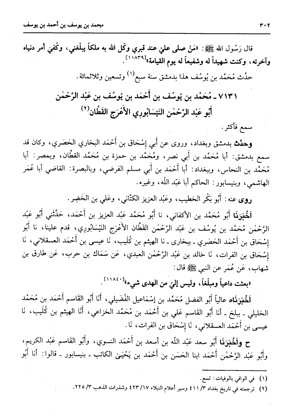 7131 - محمد بن يوسف بن أحمد بن يوسف بن عبد الرحمن أبو عبد الرحمن النيسابوري الأعرج القطان (2) سمع فأكثر وحدث بدمشق وبغداد وروى عن أبي إسحاق بن أحمد البخاري الحصري وكان قد سمع بدمشق أبا محمد بن أبي نصر ومحمد بن حمزة بن محمد القطان وبمصر أبا محمد بن النحاس وببغداد أبا أحمد بن أبي مسلم الفرضي وبالبصرة القاضي أبا عمر الهاشمي وبنيسابور الحاكم أبا عبد الله وغيره روى عنه أبو بكر الخطيب وعبد العزيز الكتاني وعلي بن الخضر أخبرنا أبو محمد بن الأكفاني نا أبو محمد بن عبد العزيز بن أحمد حدثني أبو عبد الرحمن محمد بن يوسف بن عبد الرحمن القطان الأعرج النيسابوري قدم علينا نا أبو إسحاق بن أحمد الحصري ببخارى نا الهيثم بن كليب نا عيسى بن أحمد العسقلاني نا إسحاق بن الفرات نا خالد بن عبد الرحمن العبدي عن سماك بن حرب عن طارق بن شهاب عن عمر عن النبي (صلى الله عليه وسلم) قال بعثت داعيا ومبلغا وليس إلي من الهدى شئ أخبرناه عاليا أبو الفضل محمد بن إسماعيل الفضيلي أنا أبو القاسم أحمد بن محمد الخليلي ببلخ أنا أبو القاسم علي بن أحمد بن محمد الخزاعي أنا الهيثم بن كليب نا عيسى بن أحمد العسقلاني نا إسحاق بن الفرات نا وأخبرنا أبو سعد عبد الله بن أسعد بن أحمد النسوي وأبو القاسم عبد الكريم وأبو عبد الرحمن أحمد ابنا الحسن بن أحمد بن يحيى الكاتب بنيسابور قالوا أنا أبو
