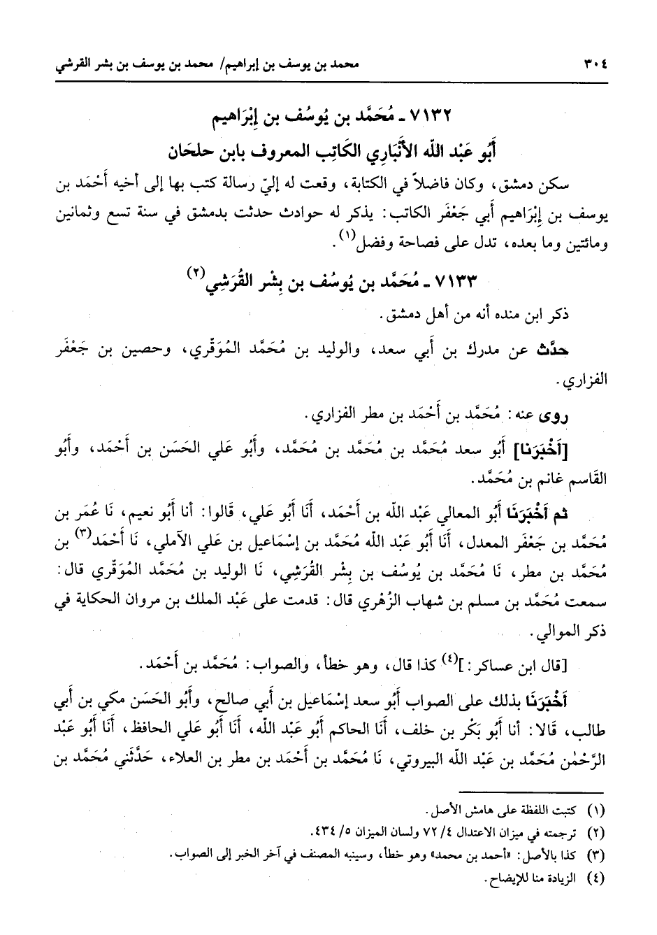 7133 - محمد بن يوسف بن بشر القرشي (2) ذكر ابن منده أنه من أهل دمشق حدث عن مدرك بن أبي سعد والوليد بن محمد الموقري وحصين بن جعفر الفزاري روى عنه محمد بن أحمد بن مطر الفزاري أخبرنا أبو سعد محمد بن محمد وأبو علي الحسن بن أحمد وأبو القاسم غانم بن محمد ثم أخبرنا أبو المعالي عبد الله بن أحمد أنا أبو علي قالوا أنا أبو نعيم نا عمر بن محمد بن جعفر المعدل أنا أبو عبد الله محمد بن إسماعيل بن علي الآملي نا أحمد (3) بن محمد بن مطر نا محمد بن يوسف بن بشر القرشي نا الوليد بن محمد الموقري قال سمعت محمد بن مسلم بن شهاب الزهري قال قدمت على عبد الملك بن مروان الحكاية في ذكر الموالي قال ابن عساكر (4) كذا قال وهو خطأ والصواب محمد بن أحمد أخبرنا بذلك على الصواب أبو سعد إسماعيل بن أبي صالح وأبو الحسن مكي بن أبي طالب قالا أنا أبو بكر بن خلف أنا الحاكم أبو عبد الله أنا أبو علي الحافظ أنا أبو عبد الرحمن محمد بن عبد الله البيروتي نا محمد بن أحمد بن مطر بن العلاء حدثني محمد بن