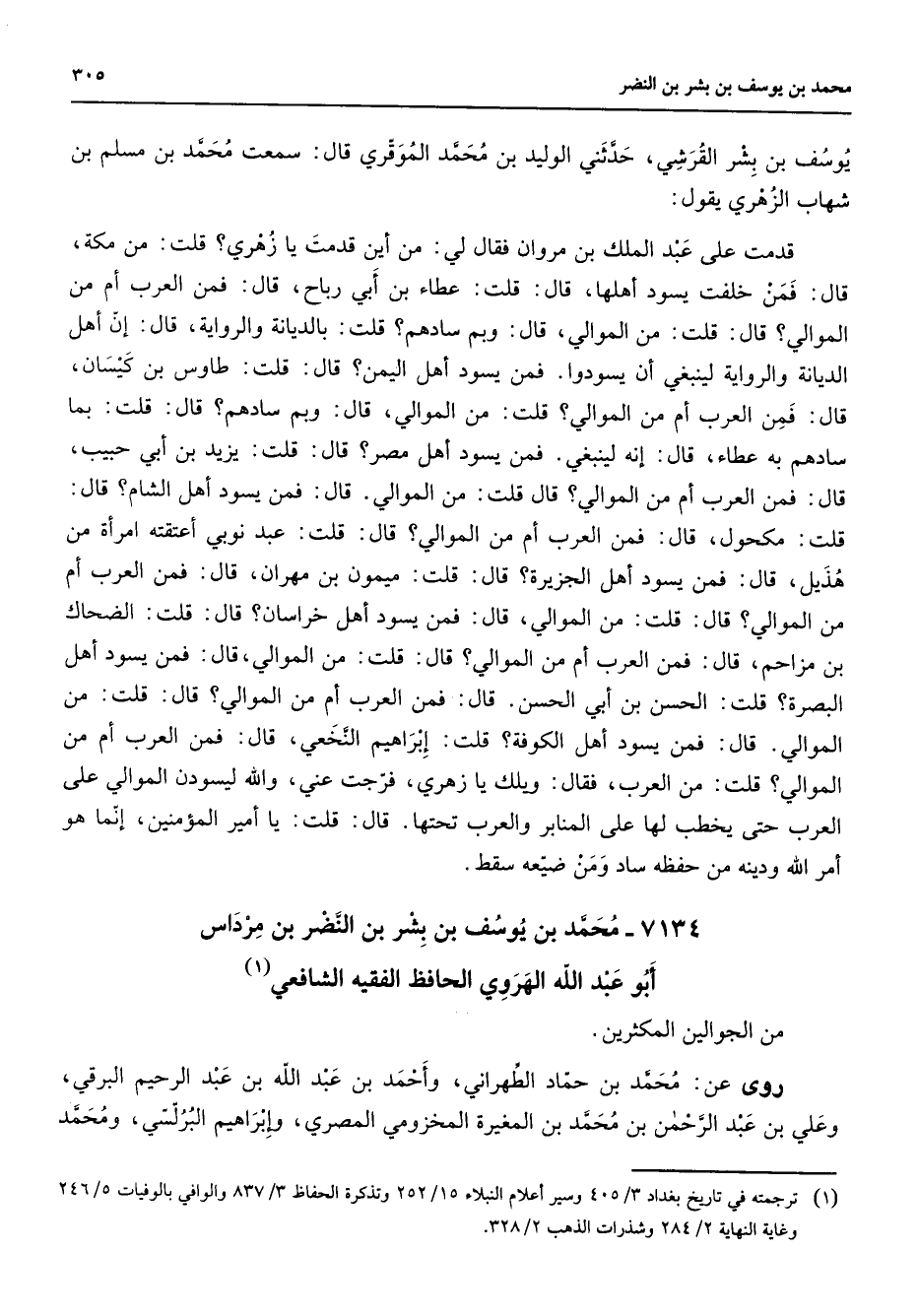 يوسف بن بشر القرشي حدثني الوليد بن محمد الموقري قال سمعت محمد بن مسلم بن شهاب الزهري يقول قدمت على عبد الملك بن مروان فقال لي من أين قدمت يا زهري قلت من مكة قال فمن خلفت يسود أهله قال قلت عطاء بن أبي رباح قال فمن العرب أم من الموالي قال قلت من الموالي قال وبم سادهم قلت بالديانة والرواية قال إن أهل الديانة والرواية لينبغي أن يسودوا فمن يسود أهل اليمن قال قلت طاووس بن كيسان قال فمن العرب أم من الموالي قلت من الموالي قال وبم سادهم قال قلت بما سادهم به عطاء قال إنه لينبغي فمن يسود أهل مصر قال قلت يزيد بن أبي حبيب قال فمن العرب أم من الموالي قال قلت من الموالي قال فمن يسود أهل الشام قال قلت مكحول قال فمن العرب أم من الموالي قال قلت عبد نوبي أعتقته امرأة من هذيل قال فمن يسود أهل الجزيرة قال قلت ميمون بن مهران قال فمن العرب أم من الموالي قال قلت من الموالي قال فمن يسود أهل خراسان قال قلت الضحاك بن مزاحم قال فمن العرب أم من الموالي قال قلت من الموالي قال فمن يسود أهل البصرة قلت الحسن بن أبي الحسن قال فمن العرب أم من الموالي قال قلت من الموالي قال فمن يسود أهل الكوفة قلت إبراهيم النخعي قال فمن العرب أم من الموالي قلت من العرب فقال ويلك يا زهري فرجت عني والله ليسودن الموالي على العرب حتى يخطب لها على المنابر والعرب تحتها قال قلت يا أمير المؤمنين إنما هو أمر الله ودينه من حفظه ساد ومن ضيعه سقط