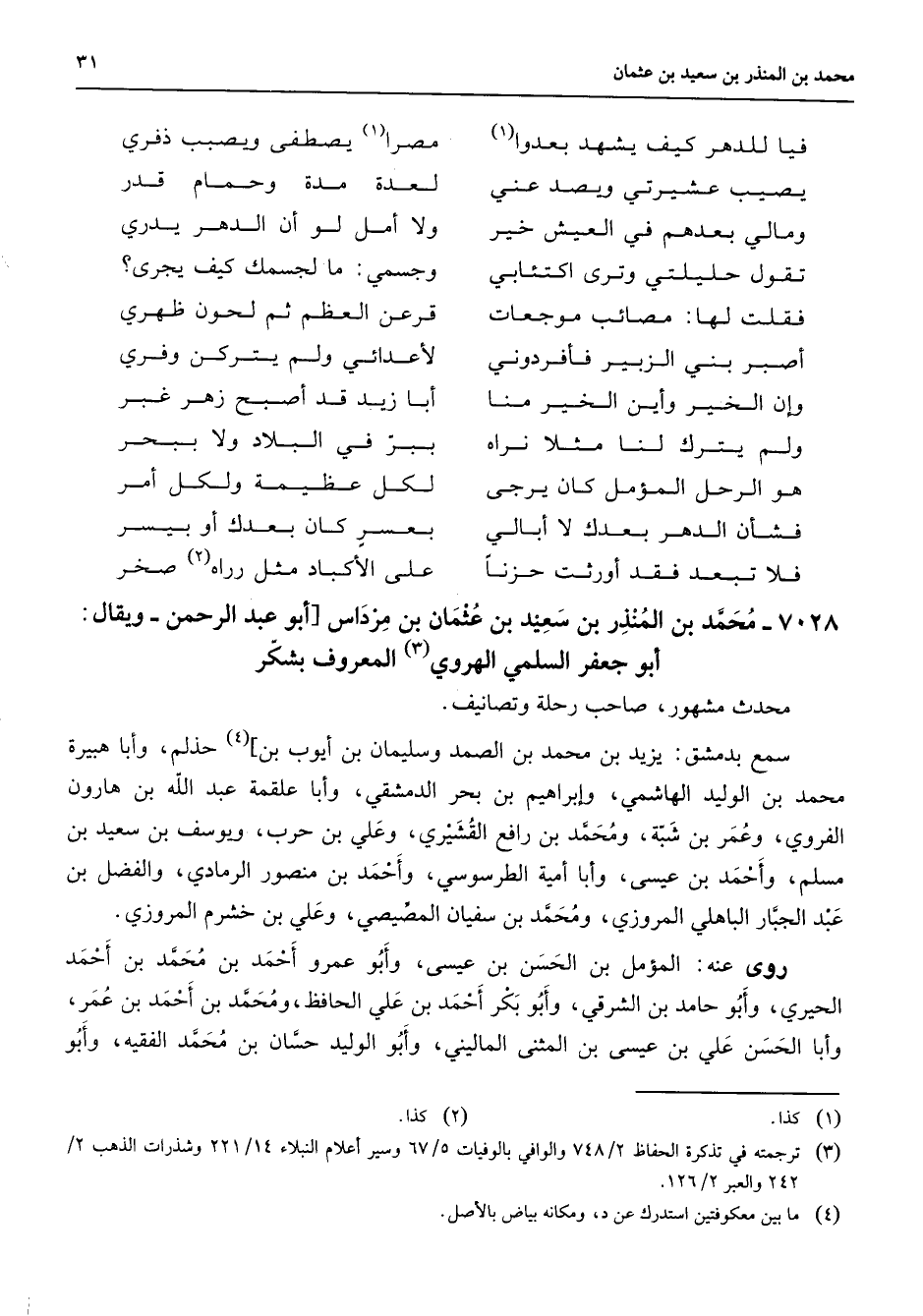 7028 - محمد بن المنذر بن سعيد بن عثمان بن مردا س أبو عبد الرحمن ويقال أبو جعفر السلمي الهروي (3) المعروف بشكر محدث مشهور صاحب رحلة وتصانيف سمع بدمشق يزيد بن محمد بن الصمد وسليمان بن أيوب بن (4) حذلم وابا هبيرة محمد بن الوليد الهاشمي وإبراهيم بن بحر الدمشقي وابا علقمة عبد الله بن هارون الفروي وعمر بن شبة ومحمد بن رافع القشيري وعلي بن حرب ويوسف بن سعيد بن مسلم وأحمد بن عيسى وأبا أمية الطرسوسي وأحمد بن منصور الرمادي والفضل بن عبد الجبار الباهلي المروزي ومحمد بن سفيان المصيصي وعلي بن خشرم المروزي روى عنه المؤمل بن الحسن بن عيسى وأبو عمرو أحمد بن محمد بن أحمد الحيري وأبو حامد بن الشرقي وأبو بكر أحمد بن علي الحافظ ومحمد بن أحمد بن عمر وابا الحسن علي بن عيسى بن المثنى الماليني وأبو الوليد حسان بن محمد الفقيه وأبو