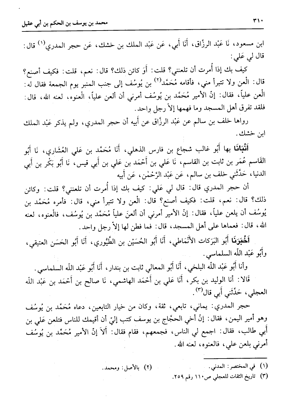 ابن مسعود نا عبد الرزاق أنا أبي عن عبد الملك بن خشك عن حجر المدري (1) قال قال لي علي كيف بك إذا أمرت أنا تلعنني قلت أو كائن ذلك قال نعم قلت فكيف أصنع قال العن ولا تتبرأ مني فأقامه محمد (2) بن يوسف إلى جنب المنبر يوم الجمعة فقال له العن عليا فقال إن الأمير محمد بن يوسف أمرني أنا ألعن عليا العنوه لعنه الله قال فلقد تفرق أهل المسجد وما فهمها إلا رجل واحد رواها خلف بن سالم عن عبد الرزاق عن أبيه أنا حجر المدري ولم يذكر عبد الملك ابن خشك أنبأنا بها أبو غالب شجاع بن فارس الذهلي أنا محمد بن علي العشاري نا أبو القاسم عمر بن ثابت بن القاسم نا علي بن أحمد بن علي بن أبي قيس نا أبو بكر بن أبي الدنيا حدثني خلف بن سالم عن عبد الرحمن عن أبيه أن حجر المدري قال قال لي علي كيف بك إذا أمرت أنا تلعنني قلت وكائن ذلك قال نعم قلت فكيف أصنع قال العن ولا تتبرأ مني قال فأمره محمد بن يوسف أنا يلعن عليا فقال إن الأمير أمرني أنا ألعن عليا محمد بن يوسف فالعنوه لعنه الله قال فعماها على أهل المسجد قال فما فطن لها إلا رجل واحد أخبرنا أبو البركات الأنماطي أنا أبو الحسين بن الطيوري أنا أبو الحسن العتيقي وأبو عبد الله السلماسي وأنا أبو عبد الله البلخي أنا أبو المعالي ثابت بن بندار أنا أبو عبد الله السلماسي قالا أنا الوليد بن بكر أنا علي بن أحمد الهاشمي نا صالح بن أحمد بن عبد الله العجلي حدثني أبي قال (3) حجر المدري يماني تابعي ثقة وكان من خيار التابعين دعاه محمد بن يوسف وهو أمير اليمن فقال إن أخي الحجاج بن يوسف كتب إلي أنا أقيمك للناس فتلعن علي بن أبي طالب فقال اجمع لي الناس فجمعهم فقام فقال ألا إن الأمير محمد بن يوسف أمرني بلعن علي فالعنوه لعنه الله
