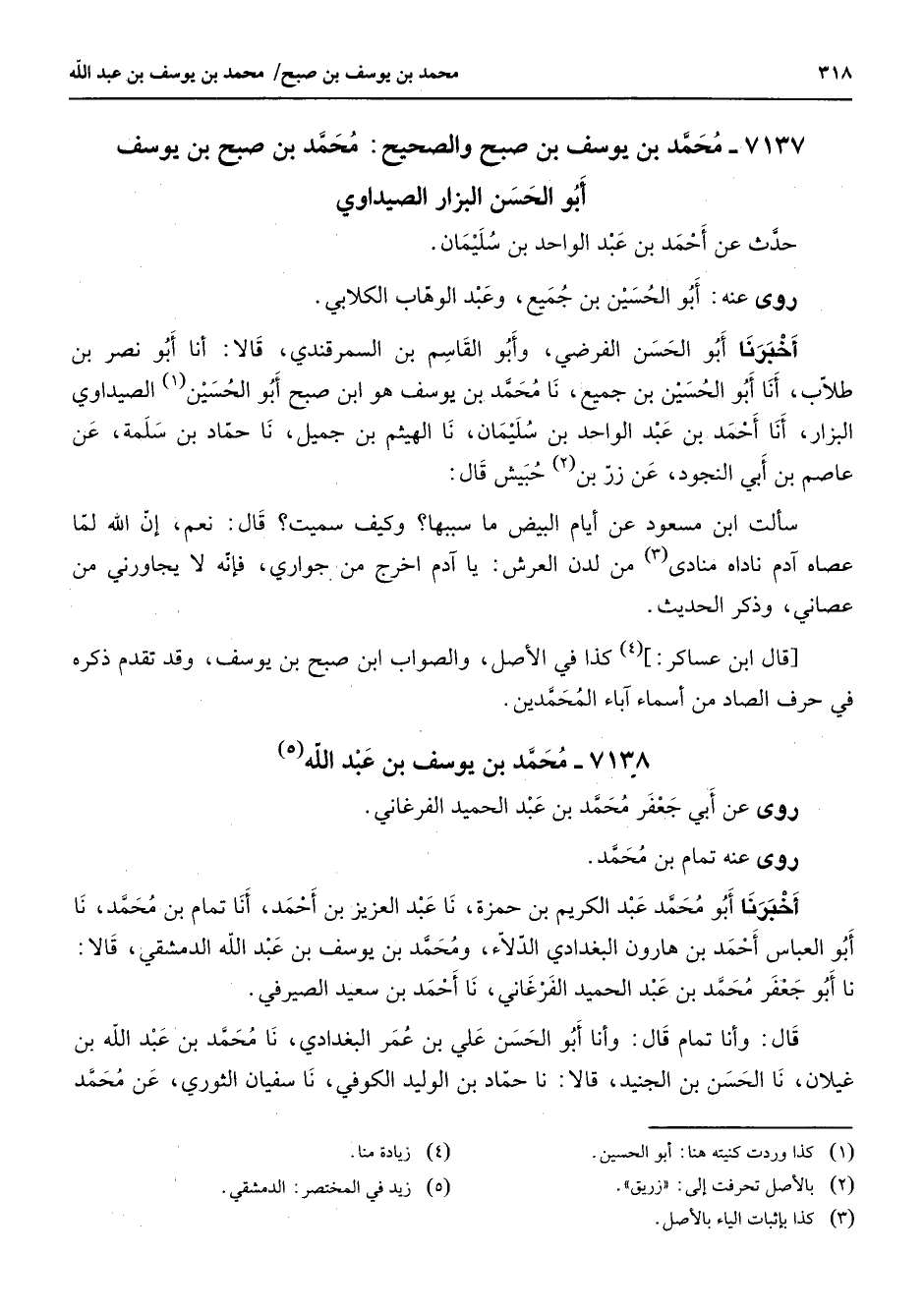 7137 - محمد بن يوسف بن صبح والصحيح محمد بن صبح بن يوسف أبو الحسن البزار الصيداوي حدث عن أحمد بن عبد الواحد بن سليمان روى عنه أبو الحسين بن جميع وعبد الوهاب الكلابي أخبرنا أبو الحسن الفرضي وابو القاسم بن السمرقندي قالا أنا أبو نصر بن طلاب أنا أبو الحسين بن جميع نا محمد بن يوسف هو ابن صبح أبو الحسين الصيداوي البزار أنا أحمد بن عبد الواحد بن سليمان نا الهيثم بن جميل نا حماد بن سلمة عن عاصم بن أبي النجود عن زر بن (2) حبيش قال سألت ابن مسعود عن أيام البيض ما سببها وكيف سميت قال نعم إن الله لما عصاه آدم ناداه منادى (3) من لدن العرش يا آدم اخرج من جواري فإنه لا يجاورني من عصاني وذكر الحديث قال ابن عساكر (4) كذا في الأصل والصواب ابن صبح بن يوسف وقد تقدم ذكره في حرف الصاد من أسماء آباء المحمدين 7138 - محمد بن يوسف بن عبد الله (5) روى عن أبي جعفر محمد بن عبد الحميد الفرغاني روى عنه تمام بن محمد أخبرنا أبو محمد عبد الكريم بن حمزة نا عبد العزيز بن أحنا تمام بن محمد نا أبو العباس أحمد بن هارون البغدادي الدلاء ومحمد بن يوسف بن عبد الله الدمشقي قالا نا أبو جعفر محمد بن عبد الحميد الفرغاني نا أحمد بن سعيد الصيرفي قال وأنا تمام قال وأنا أبو الحسن علي بن عمر البغدادي نا محمد بن عبد الله بن غيلان نا الحسن بن الجنيد قالا نا حماد بن الوليد الكوفي نا سفيان الثوري عن محمد