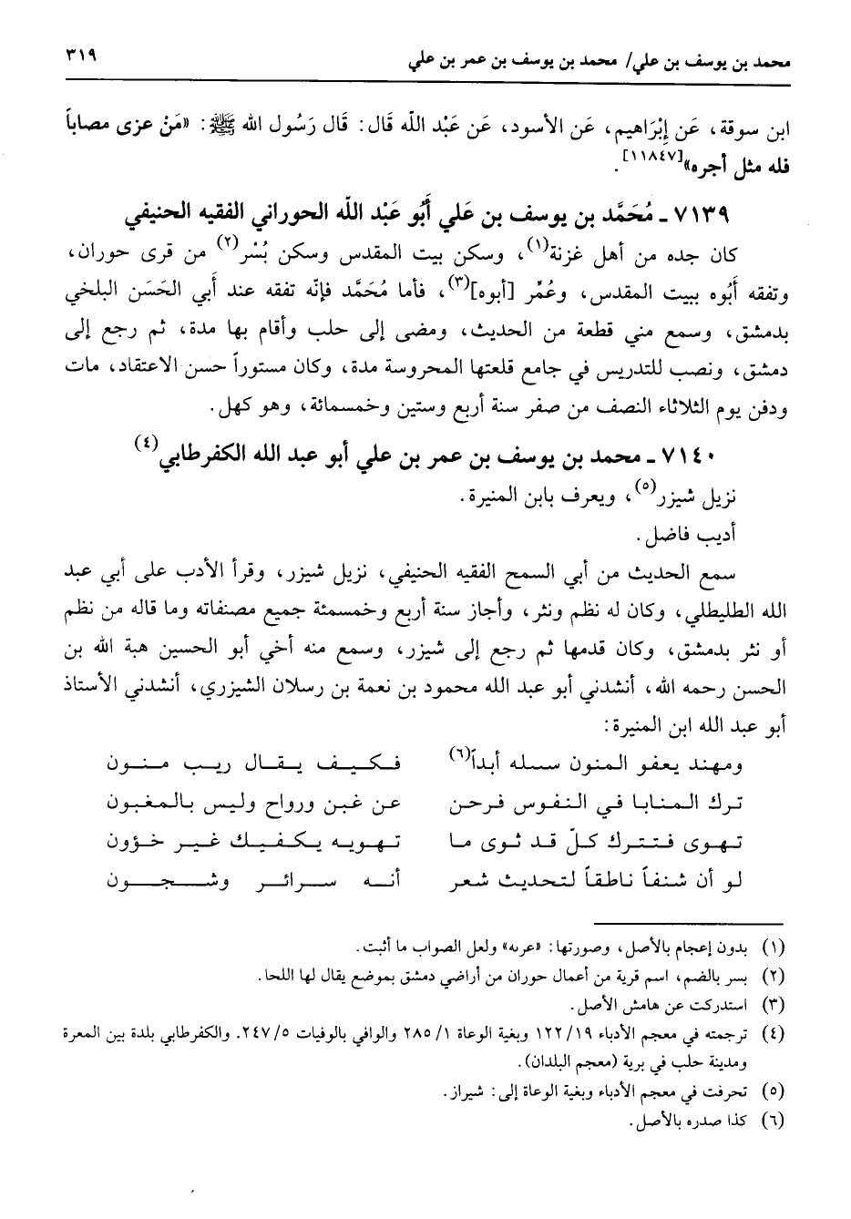 7139 - محمد بن يوسف بن علي أبو عبد الله الحوراني الفقيه الحنيفي كان جده من أهل غزنة (1) وسكن بيت المقدس وسكن بسر (2) من قرى حوران وتفقه أبوه ببيت المقدس وعمر أبوه (3) فأما محمد فإنه تفقه عند أبي الحسن البلخي بدمشق وسمع مني قطعة من الحديث ومضى إلى حلب وأقام بها مدة ثم رجع إلى دمشق ونصب للتدريس في جامع قلعتها المحروسة مدة وكان مستورا حسن الاعتقاد مات ودفن يوم الثلاثاء النصف من صفر سنة أربع وستين وخمسمائة وهو كهل 7140 - محمد بن يوسف بن عمر بن علي أبو عبد الله الكفرطابي (4) نزيل شيزر (5) ويعرف بابن المنيرة أديب فاضل سمع الحديث من أبي السمح الفقيه الحنيفي نزيل شيزر وقرأ الأدب على أبي عبد الله الطليطلي وكان له نظم ونثرو أجاز سنة أربع وخمسمئة جميع مصنفاته وما قاله من نظم أو نثر بدمشق وكان قدمهثم رجع إلى شيزر وسمع منه أخي أبو الحسين هبة الله بن الحسن رحمه الله أنشدني أبو عبد الله محمود بن نعمة بن رسلان الشيزري أنشدني الأستاذ أبو عبد الله ابن المنيرة * ومهند يعفو المنون سبيله أبدا (6) * فكيف يقال ريب منون ترك المنايا في النفوس فرحن * عن غبن ورواح وليس بالمغبون تهوى فتترك كل قد ثوى ما * تهويه يكفيك غير خؤون * * لو أنا شنفا ناطقا لتحديث شعر * أنه سرائر وشجون *