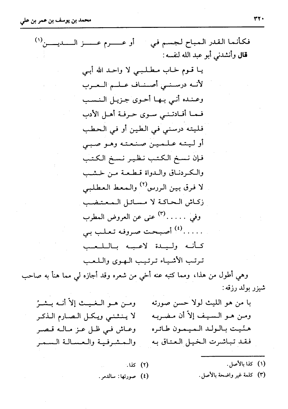 (فكأنما القدر المباح لجسم في * أو عرم عزم الدين * قال وأنشدني أبو عبد الله لنفسه * يا قوم خاب مطلبي لا واحد الله أبي * لأنه درسني أصناف علم العرب * وعنده أني بها أحوى جزيل النسب * فما أفادتني سوى حرفة أهل الأدب * فليته درسني في الطين أو في الحطب * أو ليته علمين صنعته وهو صبي * فإن نسخ الكتب نظير نسخ الكتب * والكردناق والدواة قطعة من خشب * لا فرق بين الرريق (2) والمعط العطلبي * زكاش الحاكة لا مسائل المعتضب * وفي (3) عني عن العروض المطرب * (4) أصبحت صروفه تعلب بي * كأنه وليدة لاعبه باللعب * ترتب الأشياء ترتيب الهوى واللعب وهي أطول من هذا ومما كتبه عنه أخي من شعره وقد أجازه لي مما هنأ به صاحب شيزر بولد رزقه * يا من هو الليث لولا حسن صورته * ومن هو الغيث إلا أنه بشر ومن هو السيف إلا أن مضربه * لا ينثني ويكل الصارم الذكر هنيت بالولد الميمون طائره * وعاش في ظل عز ماله قصر فقد تباشرت الخيل العتاق به * والمشرفية والعسالة السمر