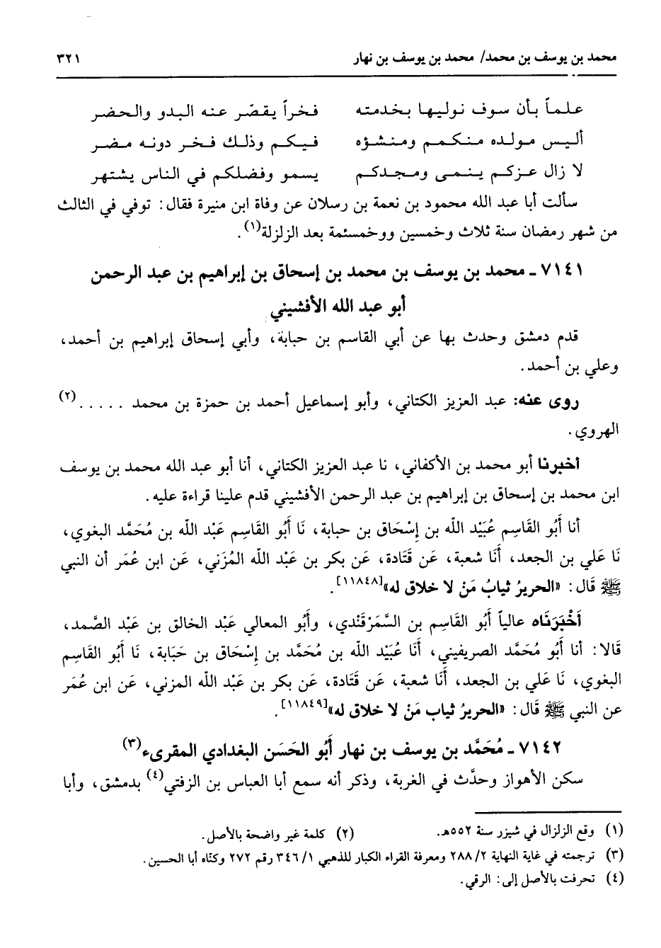 علما بأن سوف نوليها بخدمته * فخرا يقصر عنه البدو والحضر أليس مولده منكمم ومنشؤه * فيكم وذلك فخر دونه مضر لا زال عزكم ينمي ومجدكم * يسمو وفضلكم في الناس يشتهر * سألت ابا عبد الله محمود بن نعمة بن رسلان عن وفاة ابن منيرة فقال توفي في الثالث من شهر رمضان سنة ثلاث وخمسين ووخمسئمة بعد الزلزلة (1) 7141 - محمد بن يوسف بن محمد بن إسحاق بن إبراهيم بن عبد الرحمن أبو عبد الله الأفشيني قدم دمشق وحدث بها عن أبي القاسم بن حبابة وأبي إسحاق إبراهيم بن أحمد وعلي بن أحمد روى عنه عبد العزيز الكتاني وأبو إسماعيل أحمد بن حمزة بن محمد الهروي أخبرنا أبو محمد بن الأكفاني نا عبد العزيز الكتاني أنا أبو عبد الله محمد بن يوسف ابن محمد بن إسحاق بن إبراهيم بن عبد الرحمن الأفشيني قدم علينا قراءة عليه أنا أبو القاسم عبيد الله بن إسحاق بن حبابة نا أبو القاسم عبد الله بن محمد البغوي نا علي بن الجعد أنا شعبة عن قتادة عن بكر بن عبد الله المزني عن ابن عمر أن النبي (صلى الله عليه وسلم) قال الحرير ثياب من لا خلاق له أخبرناه عاليا أبو القاسم بن السمرقندي وابو المعالي عبد الخالق بن عبد الصمد قالا أنا أبو محمد الصريفيني أنا عبيد الله بن محمد بن إسحاق بن حبابة نا أبو القاسم البغوي نا علي بن الجعد أنا شعبة عن قادة عن بكر بن عبد الله المزني عن ابن عمر عن النبي (صلى الله عليه وسلم) قال الحرير ثياب من لا خلاق له 7142 محمد بن يوسف بن نهار أبو الحسن البغدادي المقرئ (3) سكن الأهواز وحدث في الغربة وذكر أنه سمع ابا العباس بن الزفتي (4) بدمشق وأبا