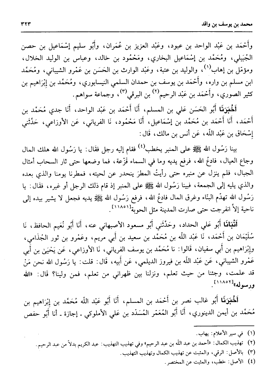 وأحمد بن عبد الواحد بن عبود وعبد العزيز بن عمران وأبو سليم إسماعيل بن حصن الجبيلي ومحمد بن إسماعيل البخاري ومحمود بن خالد وعباس بن الوليد الخلال ومؤمل بن إهاب (1) والوليد بن عتبة وعبد الوارث بن الحسن بن عمرو الشيباني ومحمد ابن مسلم بن واره وأحمد بن يوسف بن حمدان السلمي النيسابوري ومحمد بن إبراهيم بن كثير الصوري وأحمد بن عبد الرحيم (2) بن البرقي (3) وجماعة سواهم أخبرنا أبو الحسن علي بن المسلم أنا أحمد بن عبد الواحد أنا جدي محمد بن أحمد أنا أحمد بن محمد بن إسماعيل أنا محمود نا الفرياني عن الأوزاعي حدثني إسحاق بن عبد الله عن أنس بن مالك قال بينا رسول الله (صلى الله عليه وسلم) على المنبر يخطب (4) فقام إليه رجل فقال يا رسول الله هلك المال وجاع العيال فادع الله فرفع يديه وما في السماء قزعة فما وضعها حتى ثار السحاب أمثال الجبال فلم ينزل عن منبره حتى رأيت المطر ينحدر عن لحيته فمطرنا يومنا والذي بعده والذي يليه إلى الجمعة فبينا رسول الله (صلى الله عليه وسلم) على المنبر إذ قام ذلك الرجل أو غيره فقال يا رسول الله تهدم البناء وغرق المال فادع الله فرفع رسول الله (صلى الله عليه وسلم) يديه فجعل لا يشير بيده إلى ناحية إلا انفرجت حتى صارت المدينة مثل الحوبة أنبأنا أبو علي الحداد وحدثني أبو مسعود الأصبهاني عنه أنا أبو نعيم الحافظ نا سليمان بن أحمد نا عبد الله بن محمد بن سعيد بن أبي مريم وعمرو بن ثور الجذامي وإبراهيم بن أبي سفيان قالوا نا محمد بن يوسف الفرياني نا الأوزاعي عن يحيى بن أبي عمرو الشيباني عن عبد الله بن فيروز الديلمي عن أبيه قال قلت يا رسول الله نحن من قد علمت وجئنا من حيث تعلم ونزلنا بين ظهراني من تعلم فمن ولينا قال الله ورسوله أخبرنا أبو غالب نصر بن أحمد بن المسلم أنا أبو عبد الله محمد بن إبراهيم بن محمد بن أيمن الدينوري أنا أبو المعمر المسدد بن علي الأملوكي إجازة أنا أبو حفص