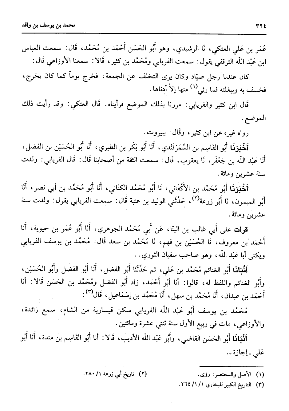 عمر بن علي العتكي نا الرشيدي وهو أبو الحسن أحمد بن محمد قال سمعت العباس ابن عبد الله الترقفي يقول سمعت الفريابي ومحمد بن كثير قالا سمعنا الأوزاعي قال كان عندنا رجل صياد وكان يرى التخلف عن الجمعة فخرج يوما كما كان يخرج فخسف به وببغلته فما رئي (1) منها إلا أدناها قال ابن كثير والفريابي مررنا بذلك الموضع فرأيناه قال العتكي وقد رأيت ذلك الموضع رواه غيره عن ابن كثير وقال ببيروت أخبرنا أبو القاسم بن السمرقندي أنا أبو بكر بن الطبري أنا أبا الحسين بن الفضل أنا عبد الله بن جعفر نا يعقوب قال سمعت الثقة من أصحابنا قال قال الفريابي ولدت سنة عشرين ومائة أخبرنا أبو محمد بن الأكفاني نا أبو محمد الكتاني أنا أبو محمد بن أبي نصر أنا أبو الميمون نا أبو زرعة (2) حدثني الوليد بن عتبة قال سمعت الفريابي يقول ولدت سنة عشرين ومائة قرأت على أبي غالب بن البنا عن أبي محمد الجوهري أنا أبو عمر بن حيوية أنا أحمد بن معروف نا الحسين بن فهم نا محمد بن سعد قال محمد بن يوسف الفريابي ويكنى أبا عبد الله وهو صاحب سفيان الثوري أنبأنا أبو الغنائم محمد بن علي ثم حدثنا أبو الفضل أنا أبو الفضل وأبو الحسين وأبو الغنائم واللفظ له قالوا أنا أبو أحمد زاد أبو الفضل ومحمد بن الحسن قالا أنا أحمد بن عبدان أنا محمد بن سهل أنا محمد بن إسماعيل قال (3) محمد بن يوسف أبو عبد الله الفريابي سكن قيسارية من الشام سمع زائدة والأوزاعي مات في ربيع الأول سنة ثنتي عشرة ومائتين أنبأنا أبو الحسن القاضي وأبو عبد الله الأديب قالا أنا أبو القاسم بن مندة أنا أبو علي إجازة