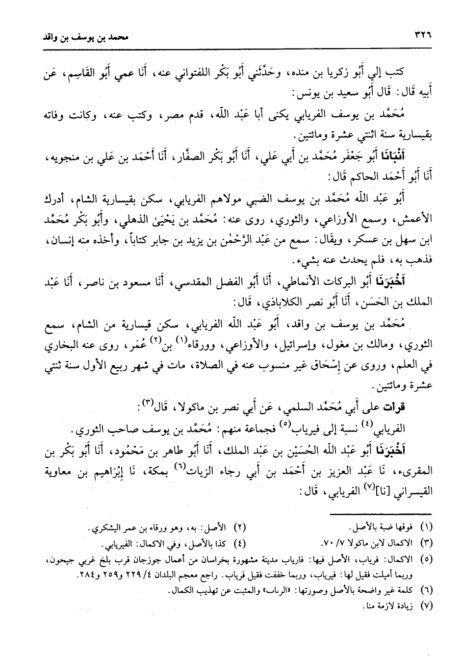 كتب إلي أبو زكريا بن منده وحدثني أبو بكر اللفتواني عنه أنا عمي أبو القاسم عن أبيه قال قال أبو سعيد بن يونس محمد بن يوسف الفريابي يكنى أبا عبد الله قدم مصر وكتب عنه وكانت وفاته بقيسارية سنة اثنتي عشرة ومائتين أنبأنا أبو جعفر محمد بن أبي علي أنا أبو بكر الصفار أنا أحمد بن علي بن منجوية أنا أبو أحمد الحاكم قال أبو عبد الله محمد بن يوسف الضبي مولاهم الفريابي سكن بقيسارية الشام أدرك الأعمش وسمع الأوزاعي والثوري روى عنه محمد بن يحيى الذهلي وأبو بكر محمد ابن سهل بن عسكر ويقال سمع من عبد الرحمن بن يزيد بن جابر كتابا وأخذه منه إنسان فذهب به فلم يحدث عنه بشئ أخبرنا أبو البركات الأنماطي أنا أبو الفضل المقدسي أنا مسعود بن ناصر أنا عبد الملك بن الحسن أنا أبو نصر الكلاباذي قال محمد بن يوسف بن واقد أبو عبد الله الفريابي سكن قيسارية من الشام سمع الثوري ومالك بن مغول وإسرائيل والأوزاعي وورقاء (1) بن (2) عمر روى عنه البخاري في العلم وروى عن إسحاق غير منسوب عنه في الصلاة مات في شهر ربيع الأول سنة ثنتي عشرة ومائتين قرأت على أبي محمد السلمي عن أبي نصر بن ماكولا قال (3) الفريابي (4) نسبة فيرياب (5) فجماعة منهم محمد بن يوسف صاحب الثوري أخبرنا أبو عبد الله الحسين بن عبد الملك أنا أبو طاهر بن محمود أنا أبو بكر بن المقرئ نا عبد العزيز بن أحمد بن أبي رجاء الزيات (6) بمكة نا إبراهيم بن معاوية القيسراني نا (7) الفريابي قال