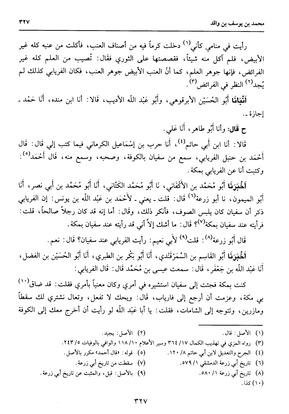 رأيت في منامي كأني (1) دخلت كرما فيه من أصناف العنب فأكلت من عنبه كله غير الأبيض فلم آكل منه شيئا فقصصتها على الثوري فقال تصيب من العلم كله غير الفرائض فإنها جوهر العلم كما أنا العنب الأبيض جوهر العنب فكان الفريابي كذلك لم يجد (2) النظر في الفرائض (3) أنبأنا أبو الحسين الأبرقوهي وأبو عبد الله الأديب قالا أنا ابن منده أنا حمد إجازة قال وأنا طاهر أنا علي قالا أنا ابن أبي حاتم (4) أنا حرب بن إسماعيل الكرماني فيما كتب إلي قال قال أحمد بن حنبل الفريابي سمع من سفيان بالكوفة وصحبه وسمع منه قال أحمد (5) وكتبت أنا عن الفريابي بمكة أخبرنا أبو محمد بن الأكفاني نا أبو محمد الكتاني أنا أبو محمد بن أبي نصر أنا أبو الميمون نا أبو زرعة (6) قال قلت يعني لأحمد بن عبد الله بن يونس إن الفريابي ذكر أن سفيان كان يلبس الصوف فأنكر ذلك وقال أما إنه قد كان رجلا صالحا قلت فرأيته عند سفيان بمكة (7) قال ما أشك إلا أني قد رأيته عند سفيان بمكة قال أبو زرعة (8) قلت (9) لأبي نعيم رأيت الفريابي عند سفيان قال نعم أخبرنا أبو القاسم بن السمرقند أنا أبو بكر بن الطبري أنا أبو الحسين بن الفضل أنا عبد الله بن جعفر قال سمعت عيسى بن محمد قال قال الفريابي كنت بمكة فجئت إلى سفيان أستشيره في أمري وكان معنيا بأمري فقلت قد ضاق (10) بي مكة وعزمت أن أرجع إلى فارياب قال ويحك لا تفعل وتعال نشتري لك سقطا ومازرين وتتوجه إلى الشامات فقلت يا أبا عبد الله لرأيت أن أخرج معك إلى الكوفة