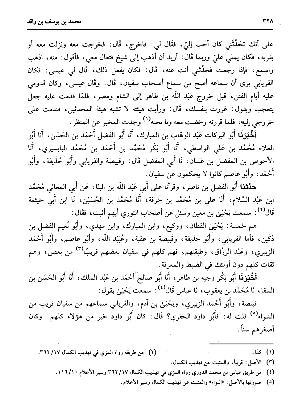 على أنك تحدثني كان أحب إلي فقال لي فاخرج قال فخرجت معه ونزلت معه أو بقربه فكان يملي علي وربما قال أريد أنا أذهب إلى شيخ فتعال معي فأقول منه اذهب واسمع فإذا رجعت فحدثني أنت عنه قال فكان يفعل ذلك قال لي عيسى فكان الفريابي يرى أنسماعه أصح من سماع أصحاب سفيان قال وقال عيسى وكان قدومي عليه أيام الفتن قبل خروج عبد الله بن طاهر إلى الشام ومصر فلما قدمت عليه جعل يتعجب ويقول غررت بنفسك قال ورأيت هيئته لا تشبه هيئة المحدثين فندمت على خروجي إليه فلما قررته وخضت معه وما نحبه (1) وجدت المخبر عن المنظر أخبرنا أبو البركات عبد الوهاب بن المبارك أنا أبو الفضل أحمد بن الحسن أنا أبو العلاء محمد بن علي الواسطي أنا أبو بكر محمد بن أحمد بن محمد البابسيري أنا الأحوص بن المفضل بن غسان نا أبي المفضل قال وقبيصة والفريابي وأبو حذيفة وأبو أحمد وأبو عاصم كانوا لا يحكمون عن سفيان حدثنا أبو الفضل بن ناصر وقرأنا على أبي عبد الله بن البنا عن أبي المعالي محمد ابن عبد السلام أنا علي بن محمد بن خزفة أنا محمد بن الحسين نا ابن أبي خيثمة قال (2) سمعت يحيى بن معين وسئل عن أصحاب الثوري أيهم أثبت فقال هم خمسة يحيى القطان ووكيع وابن المبارك وابن مهدي وأبو نعيم الفضل بن دكين فأما الفريابي وأبو حذيفة وقبيصة بن عقبة وعبيد الله وأبو عاصم وأبو أحمد الزبيري وعبد الرزاق وطبقتهم فهم كلهم في سفيان بعضهم قريب (3) من بعض وهم ثقات كلهم دون أولئك في الضبط والمعرفة أخبرنا أبو بكر وجيه بن طاهر أنا أبو صالح أحمد بن عبد الملك أنا أبو الحسن بن السقا نا محمد بن يعقوب نا عباس قال (4) سمعت يحيى يقول قبيصة وأبو أحمد الزبيري ويحيى بن آدم والفريابي سماعهم من سفيان قريب من السواء (5) قلت له فأبو داود الحفري كان أبو داود خير من هؤلاء كلهم وكان أصغرهم سنا