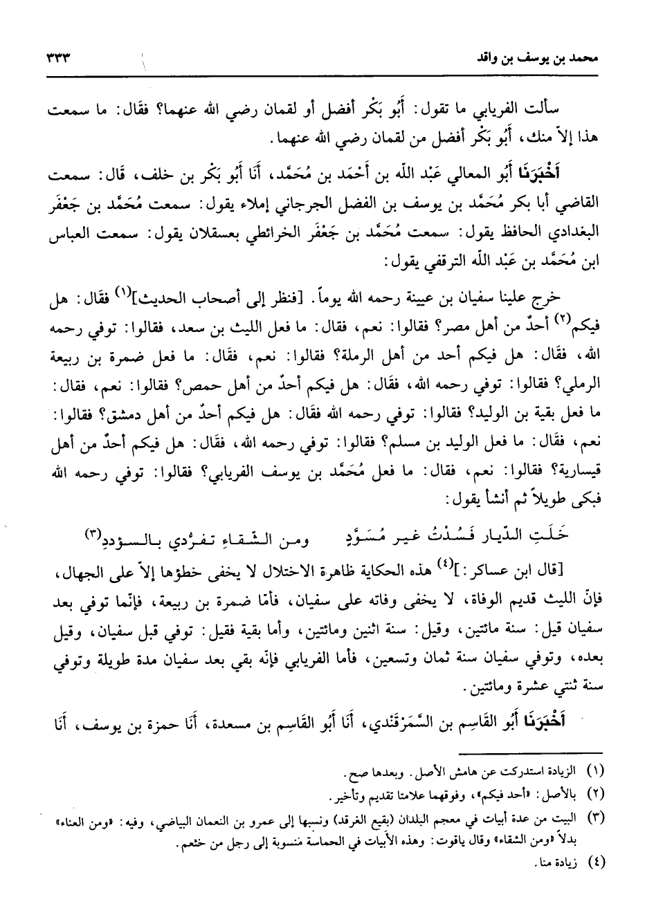 سألت الفريابي ما تقول أبو بكر أفضل أو لقمان Bهما فقال ما سمعت هذا إلا منك أبو بكر أفضل من لقمان Bهما أخبرنا أبو المعالي عبد الله بن أحمد بن محمد أنا أبو بكر بن خلف قال سمعت القاضي أبا بكر محمد بن يوسف بن الفضل الجرجاني إملاء يقول سمعت محمد بن جعفر البغدادي الحافظ يقول سمعت محمد بن جعفر الخرائطي بعسقلان يقول سمعت العباس ابن محمد بن عبد الله الترقفي يقول خرج علينا سفيان بن عيينة رحمه الله يوما فنظر إلى أصحاب الحديث (1) فقال هل فيكم (2) أحد من أهل مصر فقالوا نعم فقال ما فعل الليث بن سعد فقالوا توفي رحمه الله فقال هل فيكم أحد من أهل الرملة فقالوا نعم فقال ما فعل ضمرة بن ربيعة الرملي فقالوا توفي رحمه الله فقال هل فيكم أحد من أهل حمص فقالوا نعم فقال ما فعل بقية بن الوليد فقالوا توفي رحمه الله فقال هل فيكم أحد من أهل دمشق فقالوا نعم فقال ما فعل الوليد بن مسلم فقالوا توفي رحمه الله فقال هل فيكم أحد من أهل قيسارية فقالوا نعم فقال ما فعل محمد بن يوسف الفريابي فقالوا توفي رحمه الله فبكى طويلا ثم أنشأ يقول * خلت الديار فسدت غير مسود * ومن الشقاء تفردي بالسؤدد (3) * قال ابن عساكر (4) هذه الحكاية ظاهرة الاختلال لا يخفى خطؤها إلا على الجهال فإن الليث قديم الوفاة لا يخفى وفاته على سفيان فأما ضمر بن ربيعة فإنما توفي بعد سفيان قيل سنة مائتين وقيل سنة اثنين ومائتين وأما بقية فقيل توفي قبل سفيان وقيل بعده وتوفي سفيان سنة ثمان وتسعين فأما الفريابي فإنه بقي بعد سفيان مدة طويلة وتوفي سنة ثنتي عشرة ومائتين أخبرنا أبو القاسم بن السمرقندي أنا أبو القاسم بن مسعدة أنا حمزة بن يوسف أنا