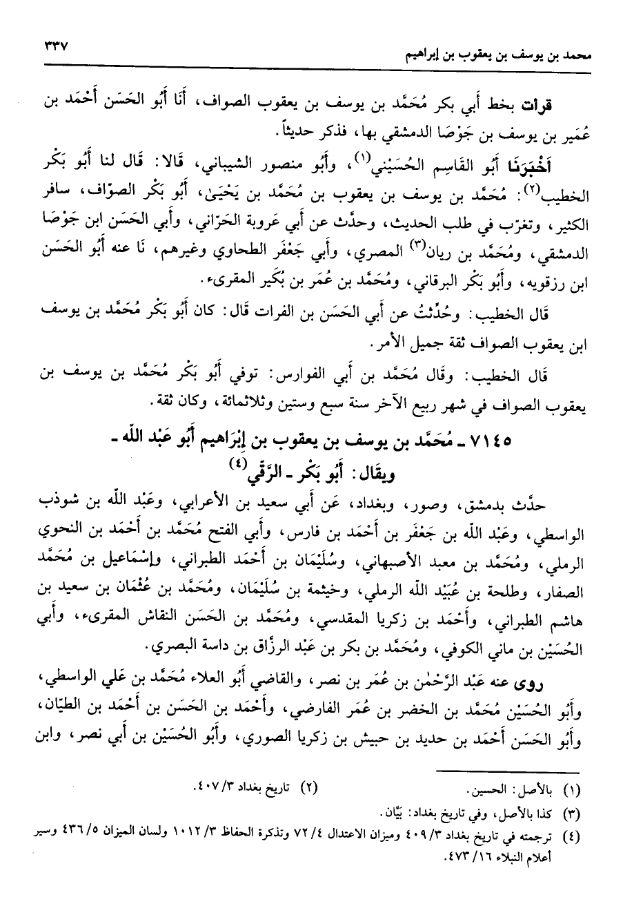 (4) ترجمته في تاريخ بغداد 3 / 409 وميزان الاعتدال 4 / 72 وتذكرة الحفاظ 3 / 1012 ولسان الميزان 5 / 436 وسير أعلام النبلاء 16 / 473