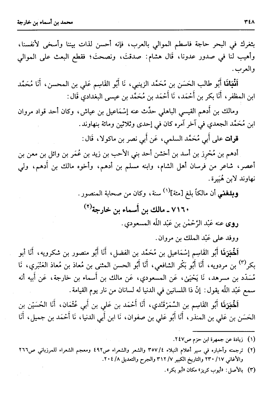 بثغرك في البحر حاجة فاسطم الموالي بالعرب فإنه أحسن لذات بيننا وأسخى لأنفسنا وأهيب لنا في صدور عدونا قال هشام صدقت ونصحت فقطع البعث على الموالي والعرب أنبأنا أبو طالب الحسن بن محمد الزينبي نا أبو القاسم علي بن المحسن أنا محمد ابن المظفر أنا بكر بن أحمد نا أحمد بن محمد بن عيسى البغدادي قال ومالك بن أدهم القيسي الباهلي حدث عنه إسماعيل بن عياش وكان أحد قواد مروان ابن محمد الجعدي في آخر مرة كان في إحدى وثلاثين ومائة بنهاوند قرأت على أبي محمد السلمي عن أبي نصر بن ماكولا قال أدهم بن محرز بن أسد بن أخشن أحد بني الأحب بن زيد بن عمر بن وائل بن معن بن أعصر شاعر من فرسان أهل الشام وابنه مسلم بن أدهم وأخوه مالك بن أدهم ولي نهاوند لابن هبيرة وبلغني أنا مالكا بلغ مائة (1) سنة وكان من صحابة المنصور 7160 - مالك بن أسماء بن خارجة (2) روى عنه عبد الرحمن بن عبد الله المسعودي ووفد على عبد الملك بن مروان أخبرنا أبو القاسم إسماعيل بن محمد بن الفضل أنا أبو منصور بن شكرويه أنا أبو بكر (3) بن مردويه أنا أبو بكر الشافعي أنا أبو الحسن المثنى بن معاذ بن معاذ العنبري نا مسدد بن مسرهد نا يحيى عن المسعودي عن مالك بن أسماء بن خارجة عن أبيه أنه سمع عبد الله يقول إن له لسانان في الدنيا له لسانان من نار يوم القيامة أخبرنا أبو القاسم بن السمرقندي أنا أحمد بن علي بن أبي عثمان أنا الحسين بن الحسن بن علي بن المنذر أنا أبو علي بن صفوان نا ابن أبي الدنيا نا أحمد بن جميل أنا