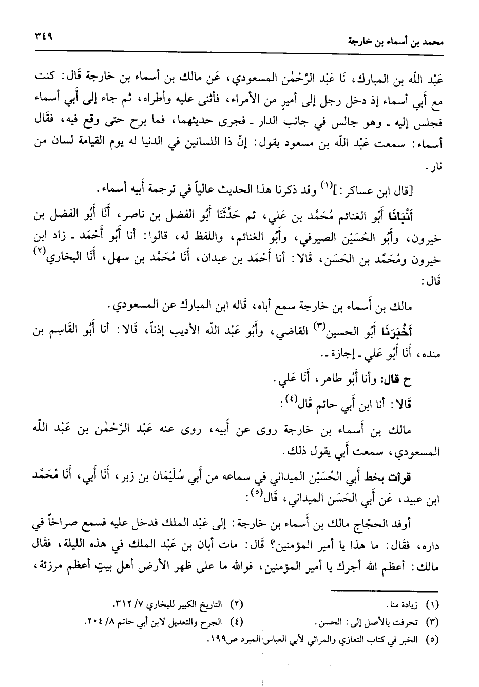 عبد الله بن المبارك نا عبد الرحمن المسعودي عن مالك بن أسماء بن خارجة قال كنت مع أبي أسماء إذ دخل رجل إلى أمير من الأمراء فأثنى عليه وأطراه ثم جاء إلى أبي أسماء فجلس إليه وهو جالس في جانب الدار فجرى حديثهما فما برح حتى وقع فيه فقال أسماء سمعت عبد الله بن مسعود يقول إن ذا اللسانين في الدنيا له يوم القيامة لسان من نار قال ابن عساكر (1) وقد ذكرنا هذا الحديث عاليا في ترجمة أبيه أسماء أنبأنا أبو الغنائم محمد بن علي ثم حدثنا أبو الفضل بن ناصر أنا أبو الفضل بن خيرون وأبو الحسين الصيرفي وأبو الغنائم واللفظ له قالوا أنا أبو احمد زاد ابن خيرون ومحمد بن الحسن قالا أنا أحمد بن عبدان أنا محمد بن سهل أنا البخاري قال مالك بن أسماء بن خارجة سمع أباه قاله ابن المبارك عن المسعودي أخبرنا أبو الحسين (3) القاضي وأبو عبد الله الأديب إذنا قالا أنا أبو القاسم بن مندة أنا أبو علي إجازة قال وأنا أبو طاهر أنا علي قالا أنا ابن أبي حاتم قا (4) مالك بن أسماء بن خارجة روى عن أبيه روى عنه عبد الرحمن بن عبد الله المسعودي سمعت أبي يقول ذلك قرأت بخط أبي الحسين الميداني في سماعه من أبي سليمان بن زبر أنا أبي أنا محمد ابن عبيد عن أبي الحسن الميداني قال (5) أوفد الحجاج مالك بن أسماء بن خارجة إلى عبد الملك فدخل عليه فسمع صراخا في داره فقال ما هذا يا أمير المؤمنين قال مات أبان بن عبد الملك في هذه الليلة فقال مالك أعظم الله أجرك يا أمير المؤمنين فوالله ما على ظهر الأرض أهل بيت أعظم مرزئة