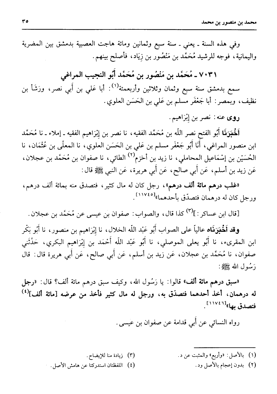 وفي هذه السنة يعني سنة سبع وثمانين ومائة هاجت العصبية بدمشق بين المضرية واليمانية فوجه للرشيد محمد بن منصور بن زياد فأصلح بينهم 7031 - محمد بن منصور بن محمد أبو النجيب المراغي سمع بدمشق سنة سبع وثمان وثلاثين واربعمئة (1) ابا علي بن أبي نصر ورشأ بن نظيف وبمصر أبا جعفر مسلم بن علي بن الحسن العلوي روى عنه نصر بن إبراهيم أخبرنا أبو الفتح نصر الله بن محمد الفقيه نا نصر بن إبراهيم الفقيه إملاء نا محمد ابن منصور المراغي أنا أبو جعفر مسلم بن علي بن الحسن العلوي نا المعلى بن عثمان نا الحسين بن إسماعيل المحاملي نا زيد بن أخزم (2) الطائي نا صفوان بن محمد بن عجلان عن زيد بن أسلم عن ابي صالح عن أبي هريرة عن النبي (صلى الله عليه وسلم) قال غلب درهم مائة ألف درهم رجل كان له مال كثير فتصدق منه بمائة ألف درهم ورجل كان له درهمان فتصدق بأحدهما قال ابن عساكر (3) كذا قال والصواب صفوان بن عيسى عن محمد بن عجلان وقد أخبرناه عاليا على الصواب أبو عبد الله الخلال نا إبراهيم بن منصور نا أبو بكر ابن المقرئ نا أبو يعلى الموصلي نا أبو عبد الله أحمد بن إبراهيم البكري حدثني صفوان نا محمد بن عجلان عن زيد بن أسلم عن أبي صالح عن أبي هريرة قال قال رسول الله (صلى الله عليه وسلم) سبق درههم مائة ألف قالوا يا رسول الله وكيف سبق درهم مائة ألف قال رجل له درهمان أخذ أحدهما فتصدق به ورجل له مال كثير فأخذ من عرضه مائة ألف (4) فتصدق بها رواه النسائي عن أبي قدامة عن صفوان بن عيسى