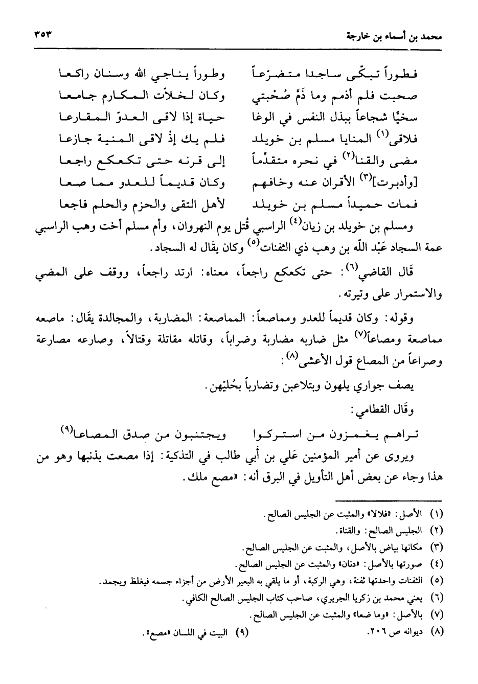فطورا تبكى ساجدا متضرعا * وطورا يناجي الله وسنان راكعا صحبت فلم أذمم وما ذم صحبتي * وكان لخلات المكارم جامعا سخيا شجاعا ببذل النفس في الوغى * حياة إذا لاقى العدو المقارعا فلاقى (1) المنايا مسلم بن خويلد * فلم يك إذ لاقى المنية جازعا مضى والقنا (2) في نحره متقدما * إلى قرنه حتى تكعكع راجعا وأدبرت (3) الأقران عنه وخافهم * وكان قديما للعدو مماصعا فمات حميد مسلم بن خويلد * لأهل التقى والحزم والحلم فاجعا * ومسلم بن خويلد بن زيان (4) الراسبي قتل يوم النهروان وأم مسلم أخت وهب الراسبي عمة السجاد عبد الله بن وهب ذي الثفنات (5) وكان يقال له السجاد قال القاضي (6) حتى تكعكع راجعا معناه ارتد راجعا ووقف على المضي والاستمرار على وتيرته وقوله وكان قديما للعدو ومماصعه المماصعة المضاربة والمجالدة يقال ماصعه مماصعة ومصاعا (7) مثل ضاربه مضاربة وضرابا وقاتله مقاتلة وقتالا وصارعه مصارعة وصراعا من المصارع قول الأعشى (8) يصف جواري يلهون ويتلاعبن وتضاربا بحليهن وقال القطامي * تراهم يغمزون من اشتركوا * ويجتنبون من صدق المصاعا (9) * ويروى عن أمير المؤمنين علي بن أبي طالب في التذكية إذا مصعت بذنبها وهو من هذا وجاء عن بعض أهل التأويل في البرق أنه مصع ملك