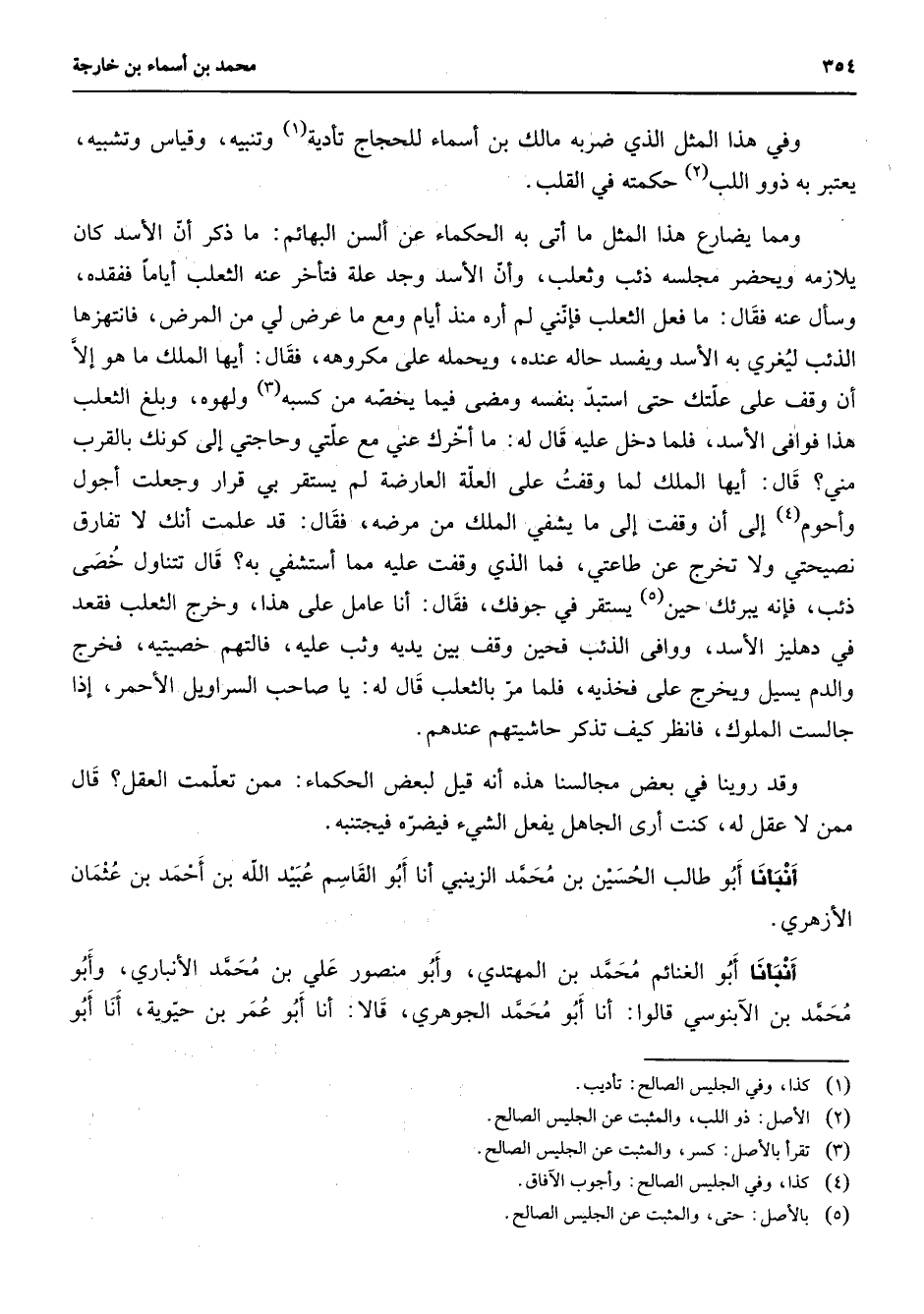 وفي هذا المثل الذي ضربه مالك بن أسماء للحجاج تأدية (1) وتنبيه وقياس وتشبيه يعتبر به ذوواللب (2) حكمته في القلب ومما يضارع هذا المثل ما أتى بالحكماء عن ألسن البهائم ما ذكر أن الأسد كان يلازمه ويحضر مجلسه ذئب وثعلب وأن الأسد وجد علة فتأخر عنه الثعلب أياما ففقده وسأل عنه فقال ما فعل الثعلب فإنني لم أره منذ أيام ومع ما عرض لي من المرض فانتهزها الذئب ليغري به الأسد ويفسد حاله عنده ويحمله على مكروهه فقال أيها الملك ما هو إلا أن وقف على علتك حتى استبد بنفسه ومضى فيما يخصه من كسبه (3) ولهوه وبلغ الثعلب هذا فوافى الأسد فلما دخل عليه قال له ما أخرك عني مع علتي وحاجتي إلى كونك بالقرب مني قال أيها الملك لما وقفت على العلة العارضة لم يستقر بي قرار وجعلت أجول وأحوم (4) إلى أن وقفت إلى ما يشفي الملك من مرضه فقال قد علمت أنك لا تفارق نصيحتي ولا تخرج عن طاعتي فما الذي وقفت عليه مما أستشفي به قال تتناول خصى ذئب فإنه يبرئك حين (5) يستقر في جوفك فقال أنا عامل على هذا وخرج الثعلب فقعد في دهليز الأسد ووافى الذئب فحين وقف بين يديه وثب عليه فالتهم خصيتيه فخرج والدم يسيل ويخرج على فخذيه فلما مر بالثعلب قال له يا صاحب السراويل الأحمر إذا جالست الملوك فانظر كيف تذكر حاشيتهم عندهم وقد روينا في بعض مجالسنا هذه أنه قيل لبعض الحكماء ممن تعلمت العقل قال ممن لا عقل له كنت أرى الجاهل يفعل الشئ فيضره فيجتنبه أنبأنا أبو طالب الحسين بن محمد الزينبي أنا أبو القاسم عبيد الله بن أحمد بن عثمان الأزهري أنبأنا أبو الغنائم محمد بن المهتدي وأبو منصور علي بن محمد الأنباري وأبو محمد بن الآبنوسي قالوا أنا أبو محمد الجوهري قالا أنا أبو عمر بن حيوية أنا أبو