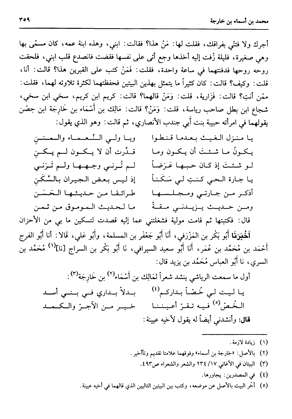 أجرك ولا فتني بفراقك فقلت لها من هذا فقالت ابني وهذه ابنة عمه كان مسمى بها وهي صغيرة فليلة زفت إليه أخذها وجع أتى على نفسها فقضت فانصدع قلب ابني فلحقت روحه روحها فدفنتهما في ساعة واحدة فقلت فمن كتب على القبرين هذا قالت أنا قلت كيف وكيف قالت كان كثيرا ما يتمثل بهذين البيتين فحفظتهما لكثرة تلاوته لهما فقلت ممن أنت قالت فزارية قلت ومن قالهما قالت كريم ابن كريم سخي ابن سخي شجاع ابن بطل صاحب رياسة قلت ومن قالت مالك بن أسماء بن خارجة ابن حصن يقولهما في امرأته حبيبة بنت أبي جندب الأنصاري ثم قالت وهو الذي يقول * يا منزل الغيث بعدما قنطوا * ويا ولي النعماء والمنن يكون ما شئت أن يكون وما * قدرت أن لا يكون لم يكن لو شئت إذ كان حبها عرضا * لم ترني وجهها ولم ترني يا جارة الحي كنت لي سكنا * إذ ليس بعض الجيران بالسكن أذكر من جارتي ومجلسها * طرائقا من حديثها الحسن ومن حديث يزيدني مقة * ما لحديث الموموق من ثمن * قال فكتبتها ثم قامت مولية فشغلتني عما إليه قصدت لتسكين ما بي من الأحزان أخبرنا أبو بكر بن المزرفي أنا أبو جعفر بن المسلمة وأبو علي قالا أنا أبو الفرج أحمد بن محمد بن عمر أنا أبو سعيد السيرافي نا أبو بكر بن السراج نا (1) محمد بن السري نا أبو العباس محمد بن يزيد قال أول ما سمعت الرياشي ينشد شعرا لماك بن أسماء (2) بن خارجة (3) * يا ليت لي خصا بداركم (4) * بدلا بداري في بني أسد الخص (5) فيه تقر أعيننا * خير من الآجر والكمد * قال وأنشدني أيضا له يقول لأخيه عيينة *