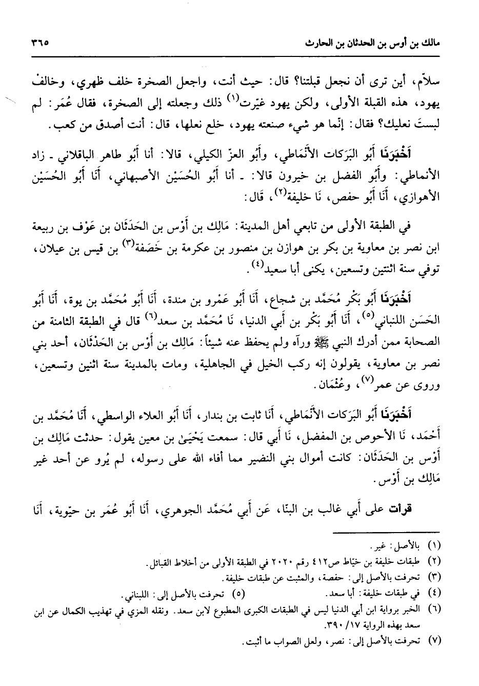 سلام أين ترى أنا نجعل قبلتنا قال حيث أنت واجعل الصخرة خلف ظهري وخالف يهود هذه القبلة الأولى ولكن يهود غيرت (1) ذلك وجعلته إلى الصخرة فقال عمر لم لبست نعليك فقال إنما هو شئ صنعته يهود خلع نعلها قال أنت أصدق من كعب أخبرنا أبو البركات الأنماطي وأبو العز الكيلي قالا أنا أبو طاهر الباقلاني زاد الأنماطي وأبو الفضل بن خيرون قالا أنا أبو الحسين الأصبهاني أنا أبو الحسين الأهوازي أنا أبو حفص نا خليفة (2) قال في الطبقة الأولى من تابعي أهل المدينة مالك بن أوس بن الحدثان بن عوف بن ربيعة ابن نصر بن معاوية بن بكر بن هوازن بن منصور بن عكرمة بن خصفة (3) بن قيس بن عيلان توفي سنة اثنتين وتسعين يكنى أبا سعيد (4) أخبرنا أبو بكر محمد بن شجاع أنا أبو عمرو بن مندة أنا أبو محمد بن يوة أنا أبو الحسن اللنباني (5) أنا أبو بكر بن أبي الدنيا نا محمد بن سعد (6) قال في الطبقة الثامنة من الصحابة ممن أدرك النبي (صلى الله عليه وسلم) ورآه ولم يحفظ عنه شيئا مالك بن أوس بن الحدثان أحد بني نصر بن معاوية يقولون إنه ركب الخيل في الجاهلية ومات بالمدينة سنة اثنين وتسعين وروى عن عمر (7) وعثمان أخبرنا أبو البركات الأنماطي أنا ثابت بن بندار أنا أبو العلاء الواسطي أنا محمد بن أحمد نا الأحوص بن المفضل نا أبي قال سمعت يحيى بن معين يقول حدثت مالك بن أوس بن الحدثان كانت أموال بني النضير مما أفاء الله على رسوله لم يرو عن أحد غير مالك بن أوس قرات على أبي غالب بن البنا عن أبي محمد الجوهري أنا أبو عمر بن حيوية أنا