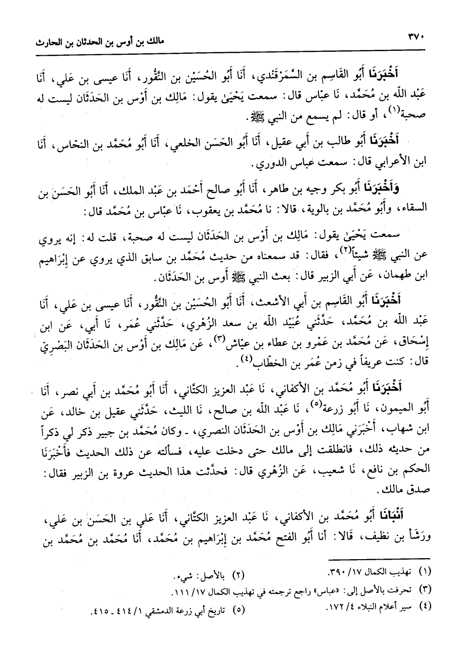 أخبرنا أبو القاسم بن السمرقندي أنا أبو الحسين بن النقور أنا عيسى بن علي أنا عبد الله بن محمد نا عباس قال سمعت يحيى يقول مالك بن أوس بن الحدثان ليست له صحبة (1) أو قال لم يسمع من النبي (صلى الله عليه وسلم) أخبرنا أبو طالب بن أبي عقيل أنا أبو الحسن الخلعي أنا محمد بن النحاس أنا ابن الأعرابي قال سمعت عباس الدوري وأخبرنا أبو بكر وجيه بن طاهر أنا أبو صالح أحمد بن عبد الملك أنا أبو الحسن بن السقاء وأبو محمد بن بالوية قالا نا محمد بن يعقوب نا عباس بن محمد قال سمعت يحيى يقوب مالك بن أوس بن الحدثان ليست له صحبة قلت له إنه يروي عن النبي (صلى الله عليه وسلم) شيئا (2) فقال قد سمعناه من حديث محمد بن سابق الذي يروي عن إبراهيم ابن طهمان عن أبي الزبير قال بعث النبي (صلى الله عليه وسلم) أوس بن الحدثان أخبرنا أبو القاسم بن أبي الأشعث أنا أبو الحسين بن النقور أنا عيسى بن علي أنا عبد الله بن محمد حدثني عبيد الله بن سعد الزهري حدثني عمر نا أبي عن ابن إسحاق عن محمد بن عمرو بن عطاء بن عياش (3) عن مالك بن أوس بن الحدثان البصري قال كنت عريفا في زمن عمر بن الخطاب (4) أخبرنا أبو محمد بن الأكفاني نا عبد العزيز الكتاني أنا أبو محمد بن أبي نصر أنا أبو الميمون نا أبو زرعة (5) نا عبد الله بن صالح نا الليث حدثني عقيل بن خالد عن ابن شهاب أخبرني مالك بن أوس بن الحدثان النصري وكان محمد بن جبير ذكر لي ذكرا من حديثه ذلك فانطلقت إلى مالك حتى دخلت عليه فسألته عن ذلك الحديث فأخبرنا الحكم بن نافع نا شعيب عن الزهري قال فحدثت هذا الحديث عروة بن الزبير فقال صدق مالك أنبأنا أبو محمد بن الأكفاني نا عبد العزيز الكتاني أنا علي بن الحسن بن علي ورشأ بن نظيف قالا أنا أبو الفتح محمد بن إبراهيم بن محمد أنا محمد بن محمد بن