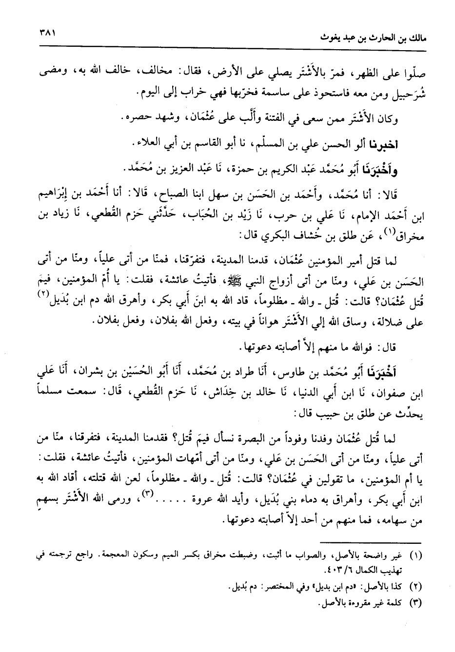 صلوا على الظهر فمر بالأشتر يصلي على الأرض فقال مخالف خالف الله به ومضى شرحبيل ومن معه فاستحوذ على ساسمة فخربها فهي خراب إلى اليوم وكان الأشتر ممن سعى في الفتنة وألب على عثمان وشهد حصره أخبرنا أبو الحسن علي بن المسلم نا أبو القاسم بن أبي العلاء وأخبرنا أبو محمد عبد الكريم بن حمزة نا عبد العزيز بن محمد قالا أنا محمد وأحمد بن الحسن بن سهل ابنا الصباح قالا أنا أحمد بن إبراهيم ابن أحمد الإمام نا علي بن حرب نا زيد بن الحباب حدثني حزم القطعي نا زياد بن محراق (1) عن طلق بن خشاف البكري قال لما قتل أمير المؤمنين عثمان قدمنا المدينة فتفرقنا فمنا من أتى عليا ومنا من أتى الحسن بن علي ومنا من أتى أزواج النبي (صلى الله عليه وسلم) فأتيت عائشة فقلت يا أم المؤمنين فيم قتل عثمان قالت قتل والله مظلوما قاد الله به ابن أبي بكر وأهرق الله دم ابن بديل (2) على ضلالة وساق الله إلي الأشتر هوانا في بيته وفعل الله بفلان وفعل بفلان قال فوالله ما منهم إلا أصابته دعوتها أخبرنا أبو محمد بن طاووس أنا طراد بن محمد أنا أبو الحسين بن بشران أنا علي ابن صفوان نا ابن أبي الدنيا نا خالد بن خداش نا حزم القطعي قال سمعت مسلما يحدث عن طلق بن حبيب قال لما قتل عثمان وفدنا وفودا من البصرة نسأل فيم قتل فقدمنا المدينة فتفرقنا منا من أتى عليا ومنا من أتى الحسن بن علي ومنا من أتى أمهات المؤمنين فأتيت عائشة فقلت يا أم المؤمنين ما تقولين في عثمان قالت قتل والله مظلوما لعن الله قتلته أقاد الله به ابن أبي بكر وأهراق به دماء بني بديل وايد الله عروة (3) ورمى الله الأشتر بسهم من سهامه فما منهم من أحد إلا أصابته دعوتها