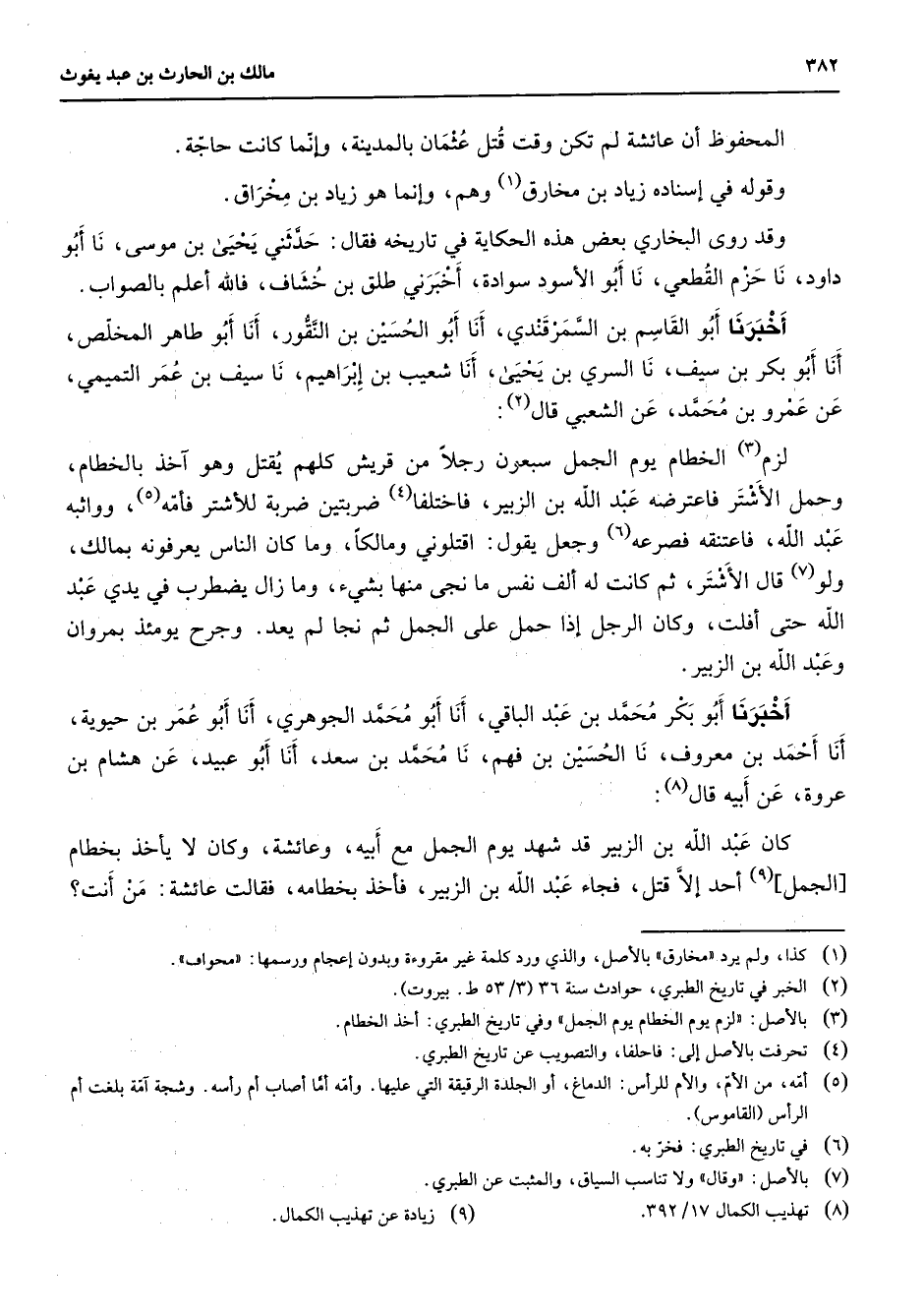 المحفوظ أن عائشة لم تكن وقت قتل عثمان بالمدينة وإنما كانت حاجة وقوله في إسناده زياد بن مخارق (1) وهم وإنما هو زياد بن مخراق وقد روى البخاري بعض هذه الحكاية في تاريخه فقال حدثني يحيى بن موسى نا أبو داود نا حزم القطعي نا أبو الأسود سوادة أخبرني طلق بن خشاف فالله أعلم بالصواب أخبرنا أبو القاسم بن السمرقندي أنا أبو الحسين بن النقور أنا أبو طاهر المخلص أنا أبو بكر بن سيف نا السري بن يحيى أنا شعيب بن إبراهيم نا سيف بن عمر التميمي عن عمرو بن محمد عن الشعبي قال (2) لزم (3) الخطام يوم الجمل سبعون رجلا من قريش كلهم يقتل وهو آخذ بالخطام وحمل الأشتر فاعترضه عبد الله بن الزبير فاختلفا (4) ضربتين ضربة للأشتر فأمه (5) وواثبه عبد الله فاعتنقه فصرعه (6) وجعل يقول اقتلوني ومالكا وما كان الناس يعرفونه بمالك ولو (7) قال الأشتر ثم كانت له ألف نفس ما نجى منها بشئ وما زال يضطرب في يدي عبد الله حتى أفلت وكان الرجل إذا حمل ثم نجا لم يعد وجرح يومئذ بمروان وعبد الله بن الزبير أخبرنا أبو بكر محمد بن عبد الباقي أنا أبو محمد الجوهري أنا أبو عمر بن حيوية أنا أحمد بن معروف نا الحسين بن فهم نا محمد بن سعد أنا أبو عبيد عن هشام بن عروة عن أبيه قال (8) كان عبد الله بن الزبير قد شهد يوم الجمل مع أبيه وعائشة وكان لا يأخذ بخطام الجمل (9) أحد إلا قتل فجاء عبد الله بن الزبير فأخذ بخطامه فقالت عائشة من أنت