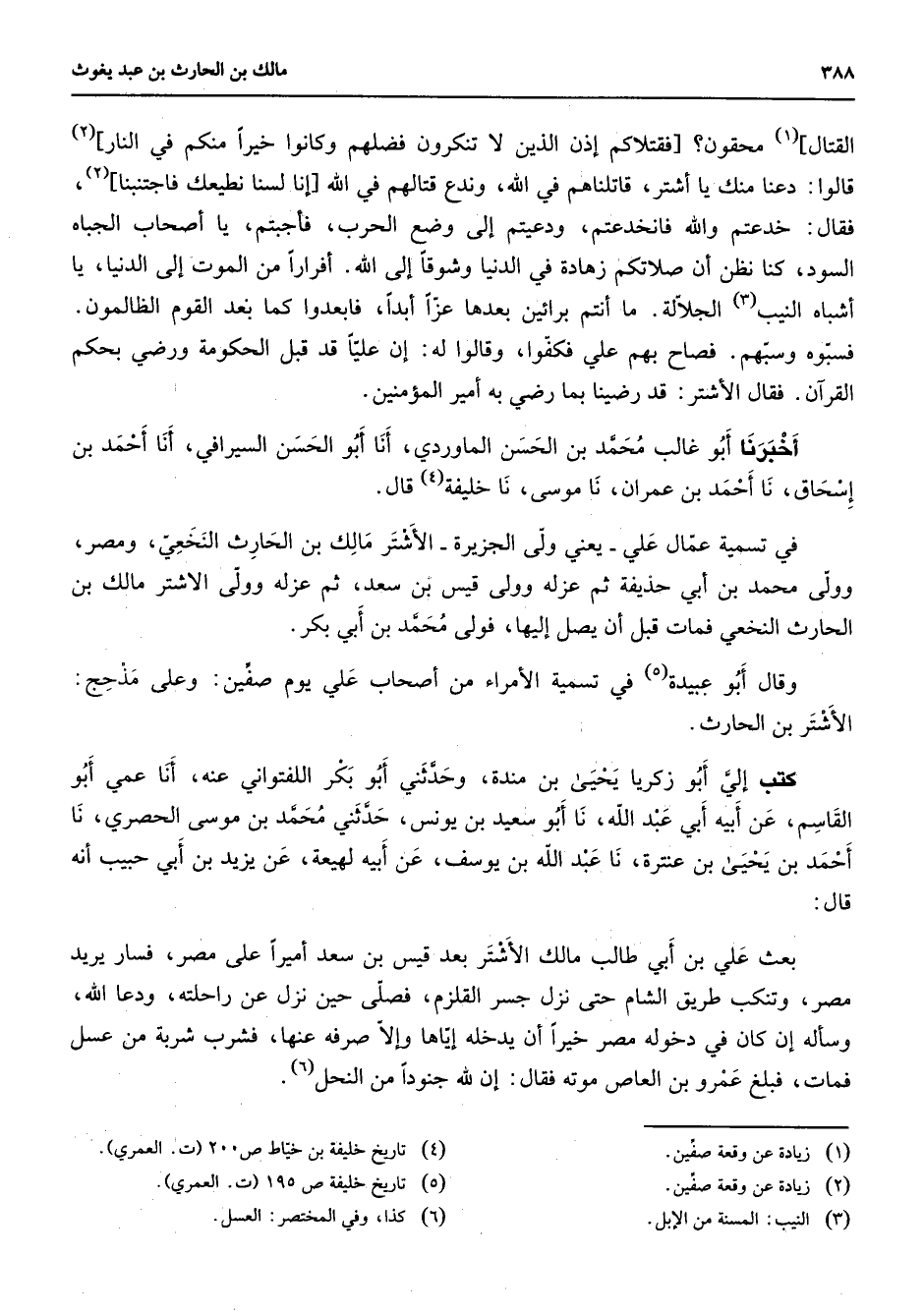 القتال (1) محقون فقتلاكم إذن الذين لا تنكرون فضلهم وكانوا خيرا منكم في النار (2) قالوا دعنا منك يا اشتر قاتلناهم في الله وندع قتالهم في الله إنالسنا نطيعك فاجتنبنا (2) فقال خدعتم والله فانخدعتم ودعيتم إلى وضع الحرب فأجبتم يا أصحاب الجباه السود كنا نظن أن صلاتكم زهادة في الدنيا وشوقا إلى الله أفرارا من الموت إلى الدنيا يا أشباه النيب (3) الجلالة ما أنتم برائين بعدها عزا أبد فابعدوا كما بعد القوم الظالمون فسبوه وسبهم فصاح بهم علي فكفوا وقالوا له إن عليا قد قبل الحكومة ورضي بحكم القرآن فقال الأشتر قد رضينا بما رضي به أمير المؤمنين أخبرنا أبو غالب محمد بن الحسن الماوردي أنا أبو الحسن السيرافي أنا أحمد بن إسحاق نا أحمد بن عمران نا موسى نا خليفة (4) قال في تسمية عمال علي يعني ولى الجزيرة الأشتر مالك بن الحارث النخعي ومصر وولى محمد بن أبي حذيفة ثم عزله وولى قيس بن سعد ثم عزله وولى الأشتر مالك بن الحارث النخعي فمات قبل أن يصل إليها فولى محمد بن أبي بكر وقال أبو عبيدة (5) في تسمية الأمراء من أصحاب علي يوم صفين وعلي مذحج الأشتر بن الحارث كتب إلي أبو زكريا يحيى بن مندة وحدثني أبو بكر اللفتواني عنه أنا عمي أبو القاسم عن أبيه أبي عبد الله نا أبو سعيد بن يونس حدثني محمد بن موسى الحصري نا أحمد بن يحيى بن عنترة نا عبد الله بن يوسف عن أبيه لهيعة عن يزيد بن ابي حبيب أنه قال بعث علي بن ابي طالب مالك الأشتر بعد قيس بن سعد أميرا على مصر فسار يريد مصر وتنكب طريق الشام حتى نزل جسر القلزم فصلى حين نزل عن راحلته ودعا الله وسأله إن كان في دخوله مصر خيرا أن يدخله إياها وإلا صرفه عنها فشرب شربة من عسل فمات فبلغ عمرو بن العاص موته فقال إن لله جنودا من النحل (6)