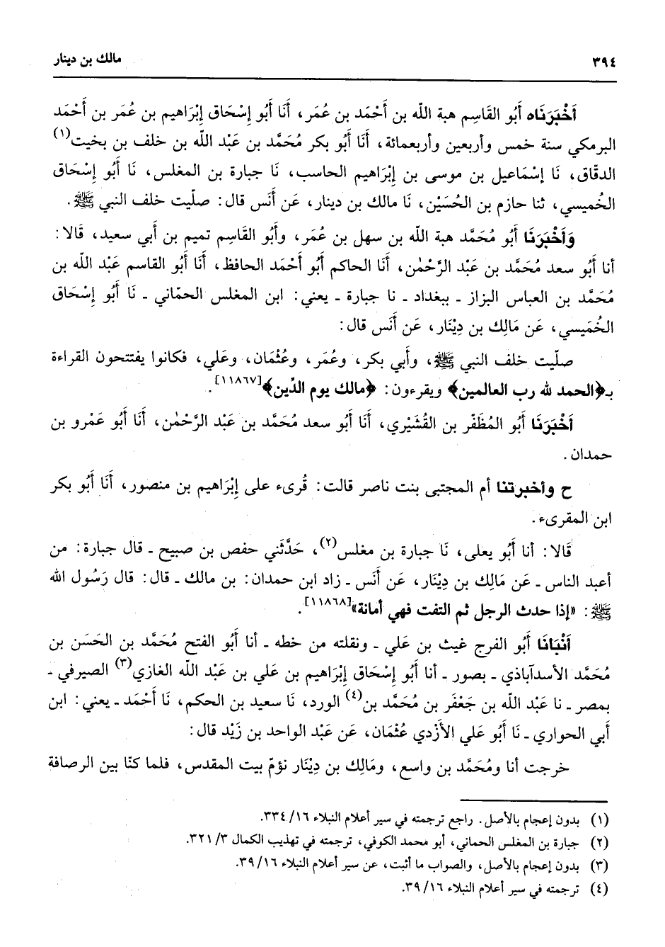 أخبرناه أبو القاسم هبة الله بن أحمد بن عمر أنا أبو إسحاق إبراهيم بن عمر بن أحمد البرمكي سنة خمس وأربعين وأربعمائة أنا أبو بكر محمد بن عبد الله بن خلف بن بخيت (1) الدقاق نا إسماعيل بن موسى بن إبراهيم الحاسب نا جبارة بن المغلس نا أبو إسحاق الخميسي ثنا حازم بن الحسين نا مالك بن دينار عن أنس قال صليت خلف النبي (صلى الله عليه وسلم) وأخبرنا أبو محمد هبة الله بن سهل بن عمر وابو القاسم تميم بن أبي سعيد قالا أنا أبو سعد محمد بن عبد الرحمن أنا الحاكم أبو أحمد الحافظ أنا أبو القاسم عبد الله بن محمد بن العباس البزاز ببغداد نا جبارة يعني ابن المغلس الحماني نا أبو إسحاق الخميسي عن مالك بن دينار عن أنس قال صليت خلف النبي (صلى الله عليه وسلم) وابي بكر وعمر وعثمان وعلي فكانوا يفتتحون القراءة ب " الحمد لله رب العالمين " ويقرءون " مالك يوم الدين " أخبرنا أبو المظفر بن القشيري أنا أبو سعد محمد بن عبد الرحمن أنا أبو عمرو بن حمدان وأخبرنا أم المجتبى بنت ناصر قالت قرئ على إبراهيم بن منصور أنا أبو بكر ابن المقرئ قالا أنا أبو يعلى نا جبارة بن مغلس (2) حدثني حفص بن صبيح قال جبارة من أعبد الناس عن مالك بن دينار عن أنس زاد ابن حمدن بن مالك قال قال رسول الله (صلى الله عليه وسلم) إذا حدث الرجل ثم التفت فهي أمانة أنبأنا أبو الفرج غيث بن علي ونقلته من خطه أنا أبو الفتح محمد بن الحسن بن محمد الأسد آباذي بصور أنا أبو إسحاق إبراهيم بن علي بن عبد الله الغازي (3) الصيرفي بمصر نا عبد الله بن جعفر بن محمد بن (4) الورد نا سعيد بن الحكم نا أحمد يعنى ابن ابي الحواري نا أبو علي الأزدي عثمان عن عبد الواحد بن زيد قال خرجت أنا ومحمد بن واسع ومالك بن دينار نؤم بيت المقدس فلما كنا بين الرصافة