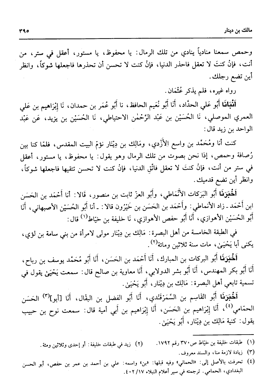 وحمص سمعنا مناديا ينادي من تلك الرمال يا محفوظ يا مستور أعقل في ستر من أنت فإن كنت لا تعقل فاحذر الدنيا فإن كنت لا تحسن أن تحذرها فاجعلها شوكا وانظر أين تضع رجلك رواه غيره فلم يذكر عثمان أنبأنا أبو علي الحداد أنا أبو نعيم الحافظ نا أبو عمر بن حمدان نا إبراهيم بن علي العمري الموصلي نا الحسين بن عبد الرحمن الاحتياطي نا الحسين بن يزيد عن عبد الواحد بن زيد قال كنت أنا ومحمد بن واسع الأزدي ومالك بن دينار نؤم البيت المقدس فلما كنا بين رصافة وحمص إذا نحن بصوت من تلك الرمال وهو يقول يا محفوظ يا مستور أعقل في ستر من أنت فإن كنت لا تعقل فاتق الدنيا فإن كنت لا تحسن تتقيها فاجعلها شوكا وانظر أين تضع قدميك أخبرنا أبو البركات الأنماطي وأبو العز ثابت بن منصور قالا أنا أحمد بن الحسن ابن أحمد زاد الأنماطي وأحمد بن الحسن بن خيرون قالا أنا أبو الحسين الأصبهاني أناإ أبو الحسين الأهوازي أنا أبو حفص الأهوازي نا خليفة بن خياط (1) قال في الطبقة الخامسة من أهل البصرة مالك بن دينار مولى لامرأة من بني سامة بن لؤي يكنى أبا يحيى مات سنة ثلاثين ومائة (2) أخبرنا أبو البركات بن المبارك أنا أحمد بن الحسن أنا أبو محمد يوسف بن رباح أنا أبو بكر المهندس أنا أبو بشر الدولابي أنا معاوية بن صالح قال سمعت يحيى يقول في تسمية تابعي أهل البصرة مالك بن دينار أبو يحيى أخبرنا أبو القاسم بن السمرقندي أنا أبو الفضل بن البقال أنا أبو (2) الحسن الحمامي (4) أنا إبراهيم بن الحسن أنا إبراهيم بن ابي أمية قال سمعت نوح بن حبيب يقول كنية مالك بن دينار أبو يحيى