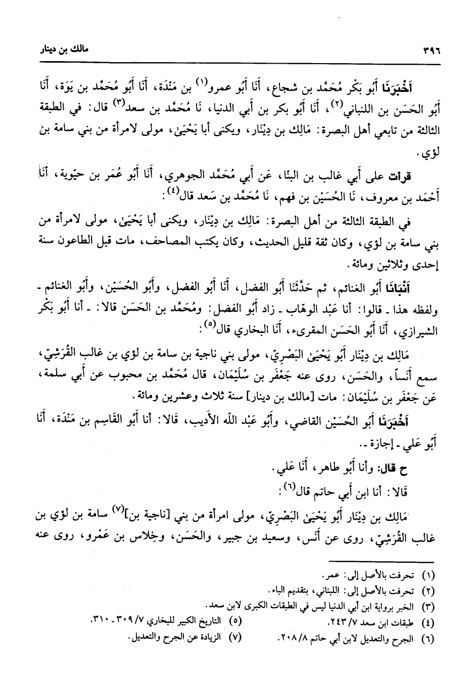الشيرازي أنا أبو الحسن المقرئ أنا البخاري قال مالك بن دينار أبو يحيى البصري مولى بني ناجية بن سامة بن لؤي بن غالب القرشي سمع أنسا والحسن روى عنه جعفر بن سليمان قال محمد بن محبوب عن أبي سلمة عن جعفر بن سليمان مات مالك بن دينار سنة ثلاث وعشرين ومائة أخبرنا أبو الحسين القاضي وأبو عبد الله الأديب قال أنا أبو القاسم بن مندة أنا أبو علي إجازة قال وأنا أبو طاهر أنا علي قالا أنا ابن أبي حاتم قال (6) مالك بن دينار أبو يحيى البصري مولى امرأة من بني ناجية (7) بن سامة بن لؤي بن غالب القرشي روى عن أنس وسعيد بن جبير والحسن وخلاس بن عمرو روى عنه
