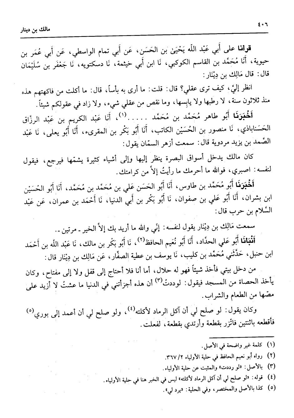 قرأنا على أبي عبد الله يحيى بن الحسن عن أبي تمام الواسطي عن أبي عمر بن حيوية أنا محمد بن القاسم الكوكبي نا ابن أبي خيثمة نا دسكتويه نا جعفر بن سليمان قال قال مالك بن دينار انظر إلي كيف ترى عقلي قال قلت ما أرى إبراهيم بأسا قال ما أكلت من فاكهتهم هذه منذ ثلاثون سنة لا رطبها ولا يابسها وما نقص من عقلي شئ ولا زاد في عقولكم شيئا أخبرنا أبو طاهر بن محمد بن محمد (1) أنا عبد الكريم بن عبد الرزاق الحسناباذي نا منصور بن الحسين الكاتب أنا أبو بكر بن المقرئ أنا أبو يعلى نا عبد الصمد بن يزيد مردوية قال سمعت أزهر السمان يقول كان مالك يدخل أسواق البصرة ينظر إليها وإلى أشياء كثيرة يشمها فيرجع فيقول لنفسه اصبري فوالله ما أحرمك ما رأيت إلا من كرامتك أخبرنا أبو محمد بن طاووس أنا أبو الحسن علي بن محمد بن محمد أنا أبو الحسين ابن بشران أنا أبو علي بن سفوان نا أبو بكر بن أبي الدنيا نا أحمد بن عمران عن عبد السلام بن حرب قال سمعت مالك بن دينار يقول لنفسه إني والله ما اريد بك إلا الخير مرتين أنبأنا أبو علي الحداد أنا أبو نعيم الحافظ (2) نا أبو بكر بن مالك نا عبد الله بن أحمد ابن حنبل حدثني محمد بن كليب نا يوسف بن عطية الصفار عن مالك بن دينار قال من دخل بيتي فأخذ شيئا فهو له حلال أما أنا فلا أحتاج إلى قفل ولا إلى مفتاح وكان يأخذ الحصاة من المسجد فيقول لوددت (3) أن هذه أجزأتني في الدنيا ما عشت لا أزيد على مصها من الطعام والشراب وكان يقول لو صلح لي أن آكل الرماد لأكلته (4) ولو صلح لي أن أعمد إلى بوري (5) فأقطعه باثنتين فاتزر بقطعة وأرتدي بقطعة لفعلت