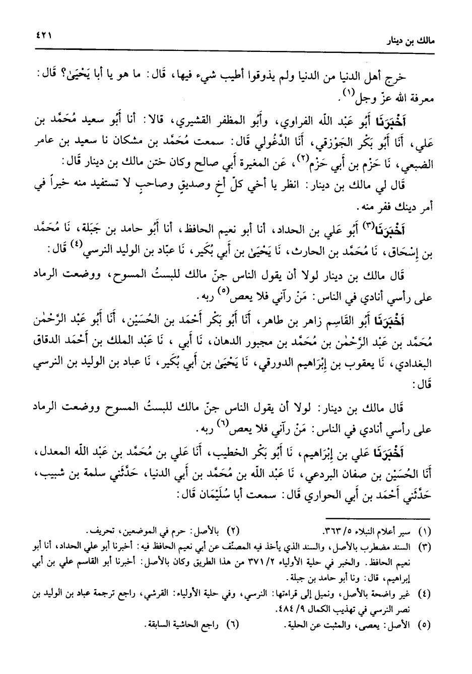 خرج أهل الدنيا من الدنيا ولم يذوقوا أطيب شئ فيها قال ما هو يا أبا يحيى قال معرفة الله عز وجل (1) أخبرنا أبو عبد الله الفراوي وأبو المظفر القشير قالا أنا أبو سعيد محمد بن علي أنا أبو بكر الجوزقي أنا الدغولي قال سمعت محمد بن مشكان نا سعيد بن عامر الضبعي نا حزم (2) بن أبي حزم عن المغيرة أبي صالح وكان ختن مالك بن دينار قال قال لي مالك بن دينار انظر يا أخي كل أخ وصديق وصاحب لا تستفيد منه خيرا في أمر دينك ففر منه أخبرنا (3) أبو علي بن الحداد أنا أبو نعيم الحافظ أنا أبو حامد بن جبلة نا محمد بن إسحاق نا محمد بن الحارث نا يحيى بن أبيي بكير نا عباد بن الوليد النرسي (4) قال قال مالك بن دينار لولا أنا يقول الناس جن مالك للبست المسوح ووضعت الرماد على رأسي أنادي في الناس من رآني فلا يعص (5) ربه أخبرنا أبو القاسم زاهر بن طاهر أنا أبو بكر أحمد بن الحسين أنا أبو عبد الرحمن محمد بن عبد الرحمن بن محمد بن مجبور الدهان نا أبي نا عبد الملك بن أحمد الدقاق البغدادي نا يعقوب بن إبراهيم الدورقي نا يحيى بن أبي بكير نا عبادة بن الوليد بن النرسي قال قال مالك بن دينار لولا أنا يقول الناس جن مالك للبست المسوح ووضعت الرماد على رأسي أنادي في الناس من رآني فلا يعص (6) ربه أخبرنا علي بن إبراهيم نا أبو بكر الخطيب أنا علي بن محمد بن عبد الله المعدل أنا الحسين بن صفان البردعي نا عبد الله بن محمد بن أبي الدنيا حدثني سلمة بن شبيب حدثني أحمد بن أبي الحواري قال سمعت أبا سليمان قال