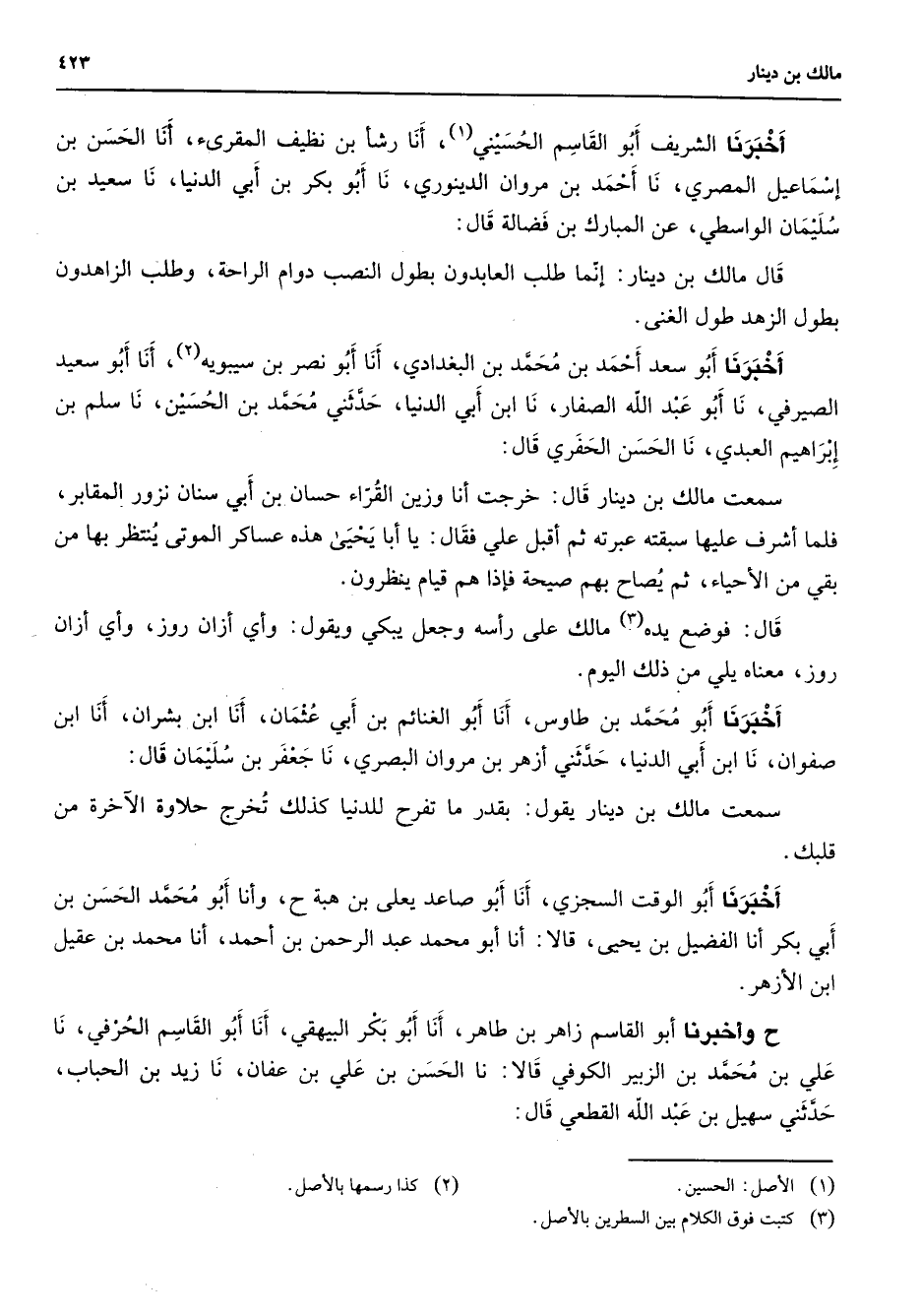 أخبرنا الشريف أبو القاسم الحسيني (1) أنا رشأ بن نظيف المقرئ أنا الحسن بن إسماعيل المصري نا أحمد بن مروان الدينوري نا أبو بكر بن أبي الدنيا نا سعيد بن سليمان الواسطي عن المبارك بن فضالة قال قال مالك بن دينار إنما طلب العابدون بطول النصب دوام الراحة وطلب الزاهدون بطول الزهد طول الغنى أخبرنا أبو سعد أحمد بن محمد بن البغدادي أنا أبو نصر بن سيبويه أنا أبو سعيد الصيرفي نا أبو عبد الله الصفار نا ابن أبي الدنيا حدثني محمد بن الحسين نا سلم بن إبراهيم العبدي نا الحسن الحفري قال سمعت مالك بن دينار قال خرجت أنا وزين القراء حسان بن أبي سنان نزور المقابر فلما أشرف عليها سبقته عبرته ثم أقبل علي فقال يا أبا يحيى هذه عساكر الموتى ينتظر بها من بقي من الأحياء ثم يصاح بهم صيحة فإذا هم قيام ينظرون قال فوضع يده (3) مالك على رأسه وجعل يبكي ويقول وأي أزان روز وأي أزان روز معناه يلي من ذلك اليوم أخبرنا أبو محمد بن طاووس أنا أبو الغنائم بن أبي عثمان أنا ابن بشران أنا ابن صفوان نا ابن أبي الدنيا حدثنا أزهر بن مروان البصري نا جعفر بن سليمان قال سمعت مالك بن دينار يقول بقدر ما تفرح للدنيا كذلك تخرج حلاوة الآخرة من قلبك أخبرنا أبو الوقت السجزي أنا أبو صاعد يعلى بن هبة وأنا أبو محمد الحسن بن أبي بكر أنا الفضيل بن يحيى قالا أنا أبو محمد عب دلارحمن بن أحمد أنا محمد بن عقيل ابن الأزهر وأخبرنا أبو القاسم زاهر بن طاهر أنا أبو بكر البيهقي أنا أبو القاسم الحرفي نا علي بن محمد بن الزبير الكوفي قالا نا الحسن بن علي بن عفان نا زيد بن الحباب حدثني سهيل بن عبد الله القطعي قال