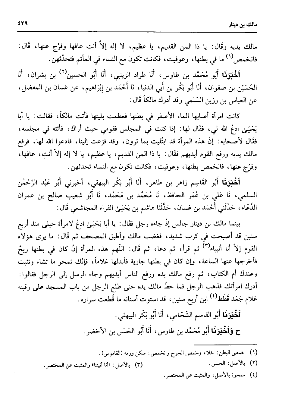 مالك يديه وقال يا ذا المن القديم يا عظيم لا إله إلا أنت عافها وفرعنها قال فانخمص (1) ما في بطنها وعوفيت فكانت تكون مع النساء في المآتم فتحدثهن أخبرنا أبو محمد بن طاووس أنا طراد الزينبي أنا أبو الحسين بن بشران أنا الحسين بن صفوان أنا أبو بكر بن أبي الدنيا نا أحمد بن إبراهيم عن غسان بن المفضل عن العباس بن رزين السلمي وقد أدرك مالكا قال كانت امرأة أصابها الماء الأصفر في بطنها فعظمت بليتها فأتت مالكا فقالت يا أبا يحيى ادع الله لي فقال لها إذا كنت في المجلس فقومي حيث أراك فأتته في مجلسه فقال لأصحابه إن هذه المراة قد ابتليت بما ترون وقد فزعت إلينا فادعوا الله لها فرفع مالك يديه ورفع القوم أيديهم فقال يا ذا المن القديم يا عظيم يا لا إله إلا أنت عافها وفرج عنها فانخمص بطنها وعوفيت فكانت تكون مع النساء تحدثهن أخبرنا أبو القاسم زاهر بن طاهر أنا أبو بكر البيهقي أخبرنا أبو عبد الرحمن السلمي نا علي بن عمر الحافظ نا محمد بن محمد نا أبو شعيب صالح بن عمران الدعاء حدثني أحمد بن غسان حدثنا هاشم بن يحيى الفراء المجاشعي قال بينما مالك بن دينار جالس إذ جاءه رجل فقال يا أبا يحيى ادع لامرأة حبلى منذ أربع سنين قد أصبحت في كرب شديد فغضب مالك وأطبق المصحف ثم قال ما يرى هؤلاء القوم إلا أنا أنبياء (3) ثم قرأ ثم دعا ثم قال اللهم هذه المرأة إن كان في بطنها ريح فأخرجها عنه الساعة وإن كان في بطنها جارية فأبدلها غلاما فإنك تمحو ما تشاء وتثبت وعندك أم الكتاب ثم رفع مالك يده ورفع الناس أيديهم وجاء الرسل إلى الرجل فقالوا أدرك امرأتك فذهب الرجل فما حط مالك يده حتى طلع الرجل من باب المسجد على رقبته غلام جعد قطط (4) ابن أربع سنين قد استوت أسنانه ما قطعت سراره أخبرنا أبو القاسم الشحامي أنا أبو بكر البيهقي وأخبرنا أبو محمد بن طاووس أنا أبو الحسن بن الأخضر