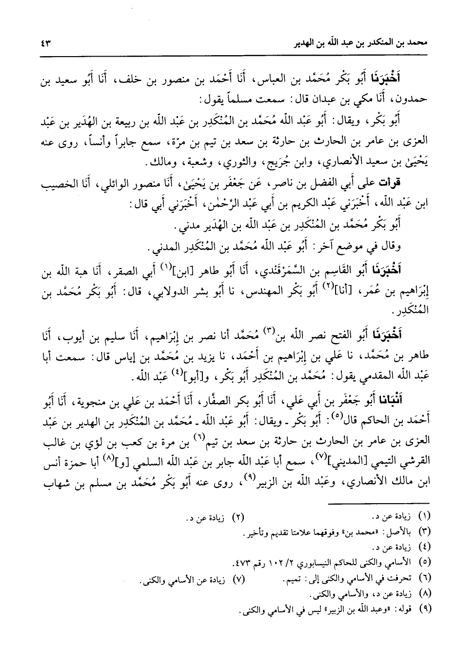 أخبرنا أبو بكر محمد بن العباس أنا أحمد بن منصور بن خلف أنا أبو سعيد بن حمدون أنا مكي بن عبدان قال سمعت مسلما يقول أبو بكر ويقال أبو عبد الله محمد بن المنكدر بن عبد الله بن ربيعة بن الهدير بن عبد العزى بن عامر بن الحارث بن حارثة بن سعد بن تيم بن مرة سمع جابرا وأنسا روى عنه يحيى بن سعيد الأنصاري وابن جريج والثوري وشعبة ومالك قرأت على أبي الفضل بن ناصر عن جعفر بن يحيى أنا منصور الوائلي أنا الخصيب ابن عبد الله أخبرني عبد الكريم بن أبي عبد الرحمن أخبرني أبي قال أبو بكر محمد بن المنكدر بن عبد الله بن الهدير مدني وقال في موضع آخر أبو عبد الله محمد بن المنكدر المدني أخبرنا أبو القاسم بن السمرقندي أنا أبو طاهر ابن أبي الصقر أنا هبة الله بن إبراهيم بن عمر أنا أبو بكر المهندس نا أبو بشر الدولابي قال أبو بكر محمد بن المنكدر أخبرنا أبو الفتح نصر الله بن محمد بن أنا نصر بن إبراهيم أنا سليم بن أيوب أنا طاهر بن محمد نا علي بن إبراهيم بن أحمد نا يزيد بن محمد بن إياس قال سمعت أبا عبد الله المقدمي يقول محمد بن المنكدر أبو بكر وأبو عبد الله أنبأنا أبو جعفر بن أبي علي أنا أبو بكر الصفار أنا أحمد بن علي بن منجوية أنا أبو أحمد بن الحاكم قال أبو بكر ويقال أبو عبد الله محمد بن المنكدر بن الهدير بن عبد العزى بن عامر بن الحارث بن حارثة بن سعد بن تيم بن مرة بن كعب بن لؤي بن غالب القرشي التيمي المديني سمع أبا عبد الله جابر بن عبد الله السلمي وأبا حمزة أنس ابن مالك الأنصاري وعبد الله بن الزبير روى عنه أبو بكر محمد بن مسلم بن شهاب