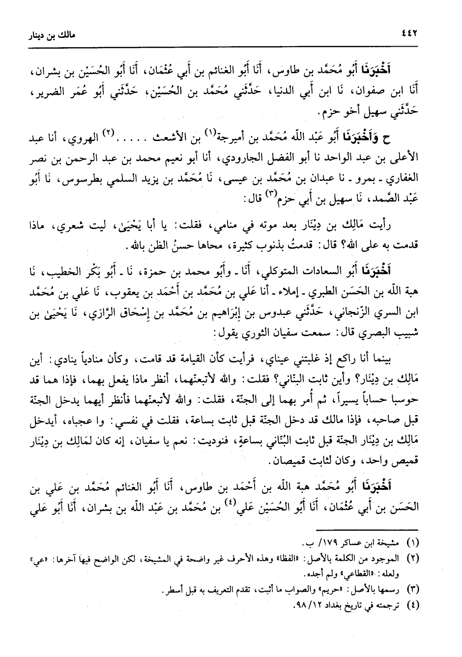 أخبرنا أبو محمد بن طاووس أنا أبو الغنائم بن أبي عثمان أنا أبو الحسين بن بشران أنا ابن صفوان نا ابن أبي الدنيا حدثني محمد بن الحسين حدثني أبو عمر الضرير حدثني سهيل أخو حزم [* * * * وأخبرنا أبو عبد الله محمد بن أميرجة (1) بن الأشعث (2) الهروي أنا عبد الأعلى بن عبد الواحد نا أبو الفضل الجارودي أنا أبو نعيم محمد بن عبد الرحمن بن نصر الغفاري بمرو نا عبدان بن محمد بن عيسى نا محمد بن يزيد السلمي بطرسوس نا أبو عبد الصمد نا سهيل بن أبي حزم (3) قال رأيت مالك بن دينار بعد موته في منامي فقلتيا أبا يحيى ليت شعري ماذا قدمت إبراهيم على الله قال قدمت بذنوب كثيرة محاها حسن الظبن الله أخبرنا أبو السعادات المتوكلي أنا وأبو محمد بن حمزة نا أبو بكر الخطيب نا هبة الله بن الحسن الطبري إملاء أنا علي بن محمد بن أحمد بن يعقوب نا علي بن محمد ابن السري الزنجاني حدثني عبدوس بن إبراهيم بن محمد بن إسحاق الرازي نا يحيى بن شبيب البصري قال سمعت سفيان الثوري يقول بينما أنا راكع إذ غلبتني عيناي فرأيت كأن القيامة قد قامت وكأن مناديا ينادي أين مالك بن دينار وأين ثابت البناني فقلت والله لأتبعنهما أنظر ماذا يفعل بهما فإذا هما قد حوسبا حسابا يسيرا ثم أمر بهما إلى الجنة فقلت والله لأتبعنهما فأنظر أيهما يدخل الجنة قبل صاحبه فإذا مالك قد دخل الجنة قبل ثابت بساعة فقلت في نفسي واعجباه أيدخل مالك بن دينار الجنة قبل ثابت البناني بساعة فنوديت نعم يا سفيان إنه كان لمالك بن دينار إ قميص واحد وكان لثابت قميصان أخبرنا أبو محمد هبة الله بن أحمد بن طاووس أنا أبو الغنائم محمد بن علي بن الحسن بن أبي عثمان أنا أبو الحسين علي (4) بن محمد بن عبد الله بن بشران أنا أبو علي