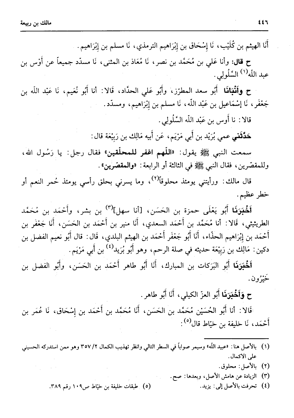 أنا الهيثم بن كليب نا إسحاق بن إبراهيم الترمذي نا مسلم بن إبراهيم قال وأنا علي بن محمد بن نصر نا معاذ بن المثنى نا مسدد جميعا عن أوس بن عبد الله (1) السلولي وأنبأنا أبو سعد المطرز وأبو علي الحداد قالا أنا أبو نعيم نا عبد الله بن جعفر نا إسماعيل بن عبد الله نا مسلم بن إبراهيم ومسدد قالا نا أوس بن عبد الله السلولي حدثني عمي بريد بن أبي مريم عن أبيه مالك بن ربيعة قال سمعت النبي (صلى الله عليه وسلم) يقول اللهم اغفر للمحلقين فقال رجل يا رسول الله وللمقصرين فقال النبي (صلى الله عليه وسلم) في الثالثة أو الرابعة والمقصرين قال مالك ورأيتني يومئذ محلوقا وما يسرني بحلق رأسي يومئذ حمر النعم أو خطر عظيم أخبرنا أبو يعلى حمزة بن الحسن أنا سهل (3) بن بشر وأحمد بن محمد الطريثيثي قالا أنا محمد بن أحمد السعدي أنا منير بن أحمد بن الحسن أنا جعفر بن أحمد بن إبراهيم الحذاء أنا أبو جعفر أحمد بن الهيثم البلدي قال قال أبو نعيم الفضل بن دكين مالك بن ربيعة حديثه في صلة الرحم وهو أبو بريد (4) بن أبن مريم أخبرنا أبو البركات بن المبارك أنا أبو طاهر قالا أنا أبو الحسين محمد بن الحسن أنا محمد بن أحمد بن إسحاق نا عمر بن أحمد نا خليفة بن خياط قال (5)