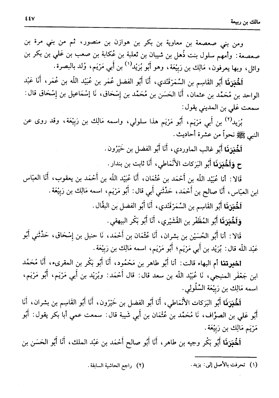 ومن بني صعصعة بن معاوية بن بكر بن هوازن بن منصور ثم من بني مرة بن صعصعة وأمهم سلول بنت ذهل بن شيبان بن ثعلبة بن عكابة بن صعب بن علي بن بكر بن وائل وبها يعرفون مالك بن ربيعة وهو أبو بريد (1) بن أبي مريم ولد بالبصرة أخبرنا أبو القاسم بن السمرقندي أنا أبو الفضل عمر بن عبيد الله بن عمر أنا عبد الواحد بن محمد بن عثمان أنا الحسن بن محمد بن إسحاق نا إسماعيل بن إسحاق قال سمعت علي ابن المديني يقول بريد (2) بن أبي مريم أبو مريم هذا سلولي واسمه مالك بن ربيعة وقد روى عن النبي (صلى الله عليه وسلم) نحوا من عشرة أحاديث أخبرنا أبو غالب الماوردي أنا أبو الفضل بن خيرون وأخبرنا أبو البركات الأنماطي أنا ثابت بن بندار قالا أنا عبيد الله بن أحمد بن عثمان أنا عبيد الله بن أحمد بن يعقوب أنا العباس ابن العباس أنا صالح بن أحد حدثني أبي قال أبو مريم اسمه مالك بن ربيعة أخبرنا أبو القاسم بن السمرقندي أنا أبو الفضل بن البقال وأخبرنا أبو المظفر بن القشيري أنا أبو بكر البيهقي قالا أنا أبو الحسين بن بشران أنا عثمان بن أحمد نا حنبل بن إسحاق حدثني أبو عبد الله قال بريد بن أبي مريم أبو مريم اسمه مالك بن ربيعة أخبرتنا أم البهاء قالت أنا أبو طاهر بن محمود أنا أبو بكر بن المقرئ أنا محمد ابن جعفر المنبجي نا عبيد الله بن سعد قال قال أحمد وبريد بن أبي مريم أبو مريم اسمه مالك بن ربيعة السلولي أخبرنا أبا البركات الأنماطي أنا أبو الفضل بن خيرون أنا أبو القاسم بن بشران أنا أبو علي بن الصواف نا محمد بن عثمان بن أبي شيبة قال سمعت عمي أبا بكر يقول أبو مريم مالك بن ربيعة أخبرنا أبو بكر وجيه بن طاهر أنا أبو صالح أحمد بن عبد الملك أنا أبو الحسن