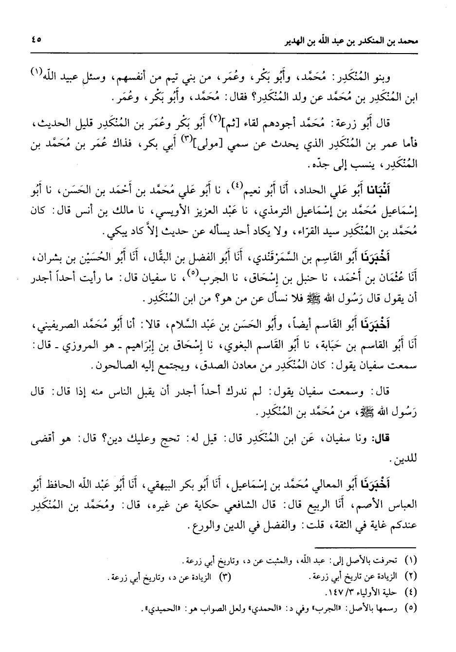 وبنو المنكدر محمد وأبو بكر وعمر من بني تيم من أنفسهم وسئل عبيد الله ابن المنكدر بن محمد عن ولد المنكدر فقال محمد وأبو بكر وعمر قال أبو زرعة محمد أجودهم لقاء ثم أبو بكر وعمر بن المنكدر قليل الحديث فأما عمر بن المنكدر الذي يحدث عن سمي مولى أبي بكر فذاك عمر بن محمد بن المنكدر ينسب إلى جده أنبأنا أبو علي الحداد أنا أبو نعيم نا أبو علي محمد بن أحمد بن الحسن نا أبو إسماعيل محمد بن إسماعيل الترمذي نا عبد العزيز الأويسي نا مالك بن أنس قال كان محمد بن المنكدر سيد القراء ولا يكاد أحد يسأله عن حديث إلا كاد يبكي أخبرنا أبو القاسم بن السمرقندي أنا أبو الفضل بن البقال أنا أبو الحسين بن بشران أنا عثمان بن أحمد نا حنبل بن إسحاق نا الجرب نا سفيان قال ما رأيت أحدا أجدر أن يقول قال رسول الله (صلى الله عليه وسلم) فلا نسأل عن من هو من ابن المنكدر أخبرنا أبو القاسم أيضا وأبو الحسن بن عبد السلام قالا أنا أبو محمد الصريفيني أنا أبو القاسم بن حبابة نا أبو القاسم البغوي نا إسحاق بن إبراهيم هو المروزي قال سمعت سفيان يقول كان المنكدر من معادن الصدق ويجتمع إليه الصالحون قال وسمعت سفيان يقول لم ندرك أحدا أجدر أن يقبل الناس منه إذا قال قال رسول الله (صلى الله عليه وسلم) من محمد بن المنكدر قال ونا سفيان عن ابن المنكدر قال قيل له تحج وعليك دين قال هو أقضى للدين أخبرنا أبو المعالي محمد بن إسماعيل أنا أبو بكر البيهقي أنا أبو عبد الله الحافظ أبو العباس الأصم أنا الربيع قال قال الشافعي حكاية عن غيره قال ومحمد بن المنكدر عندكم غاية في الثقة قلت والفضل في الدين والورع