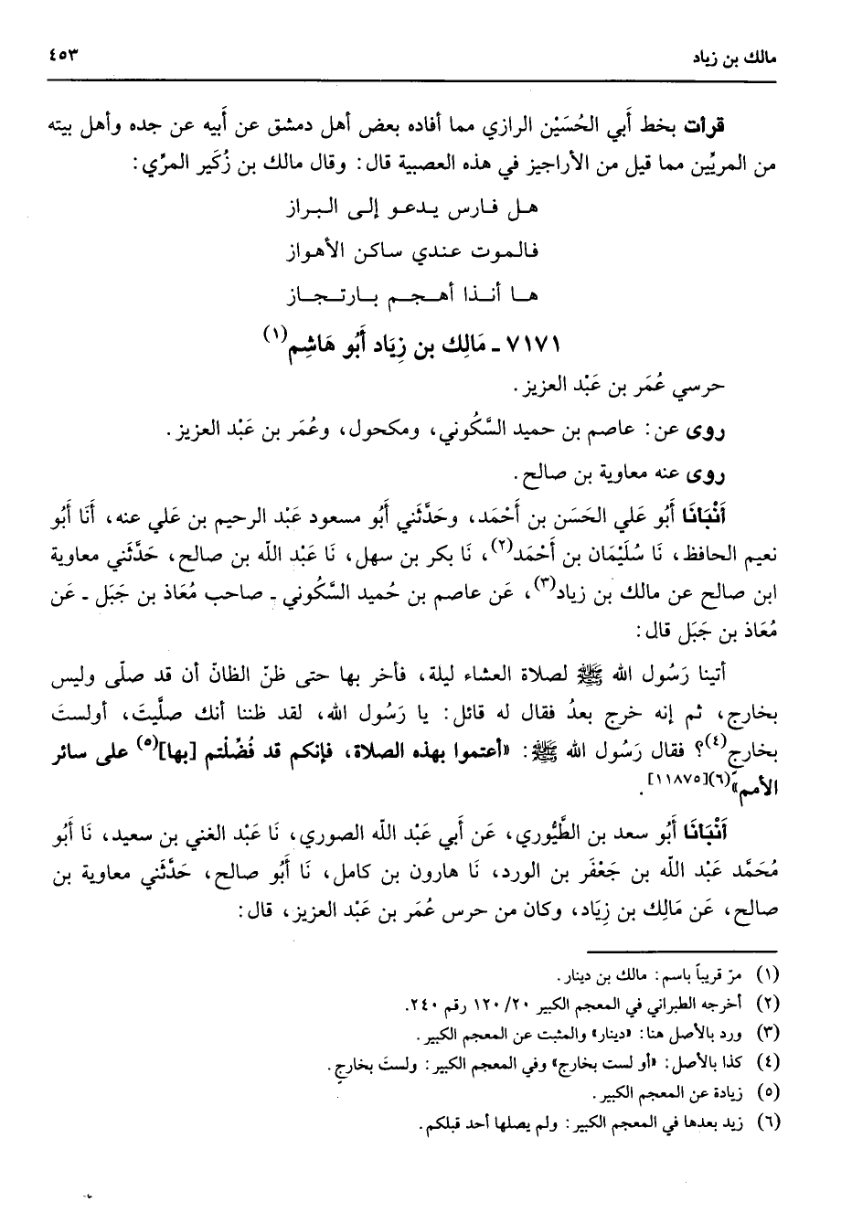 قرأت بخط أبي الحسين الرازي مما أفاده بعض أهل دمشق عن أبيه عن جده وأهل بيته من المربين مما قيل من الأراجيز في هذه العصبية قال وقال مالك بن زكير المري * هل فارس يدعو إلى البراز * فالموت عندي ساكن الأهواز * ها أنذا أهجم بارتجاز 7171 - مالك بن زياد أبو هاشم (1) حرسي عمر بن عبد العزيز روى عن عاصم بن حميد السكوني ومكحول وعمر بن عبد العزيز روى عنه معاوية بن صالح أنبأنا أبو علي الحسن بن أحمد وحدثني أبو مسعود عبد الرحيم بن علي عنه أنا أبو نعيم الحافظ نا سليمان بن أحمد (2) نا بكر بن سهل نا عبد الله بن صالح حدثني معاوية ابن صالح عن مالك بن زياد (3) عن عاصم بن حميد السكوني صاحب معاذ بن جبل عن معاذ بن جبل قال أتينا رسول الله (صلى الله عليه وسلم) لصلاة العشاء ليلة فأخر بها حتى ظن الظان أن قد صلى وليس بخارج ثم إنه خرج بعد فقال له قائل يا رسول الله لقد ظننا أنك صليت أو لست بخارج (4) فقال رسول الله (صلى الله عليه وسلم) أعتمر بهذه الصلاة فإنكم قد فضلتم بها (5) على سائر الأمم (6) أنبأنا أبو سعد بن الطيوري عن أبي عبد الله الصوري نا عبد الغني بن سعيد نا أبو محمد عبد الله بن جعفر بن الورد نا هارون بن كامل نا أبو صالح حدثني معاوية بن صالح عن مالك بن زياد وكان من حرس عمر بن عبد العزيز قال